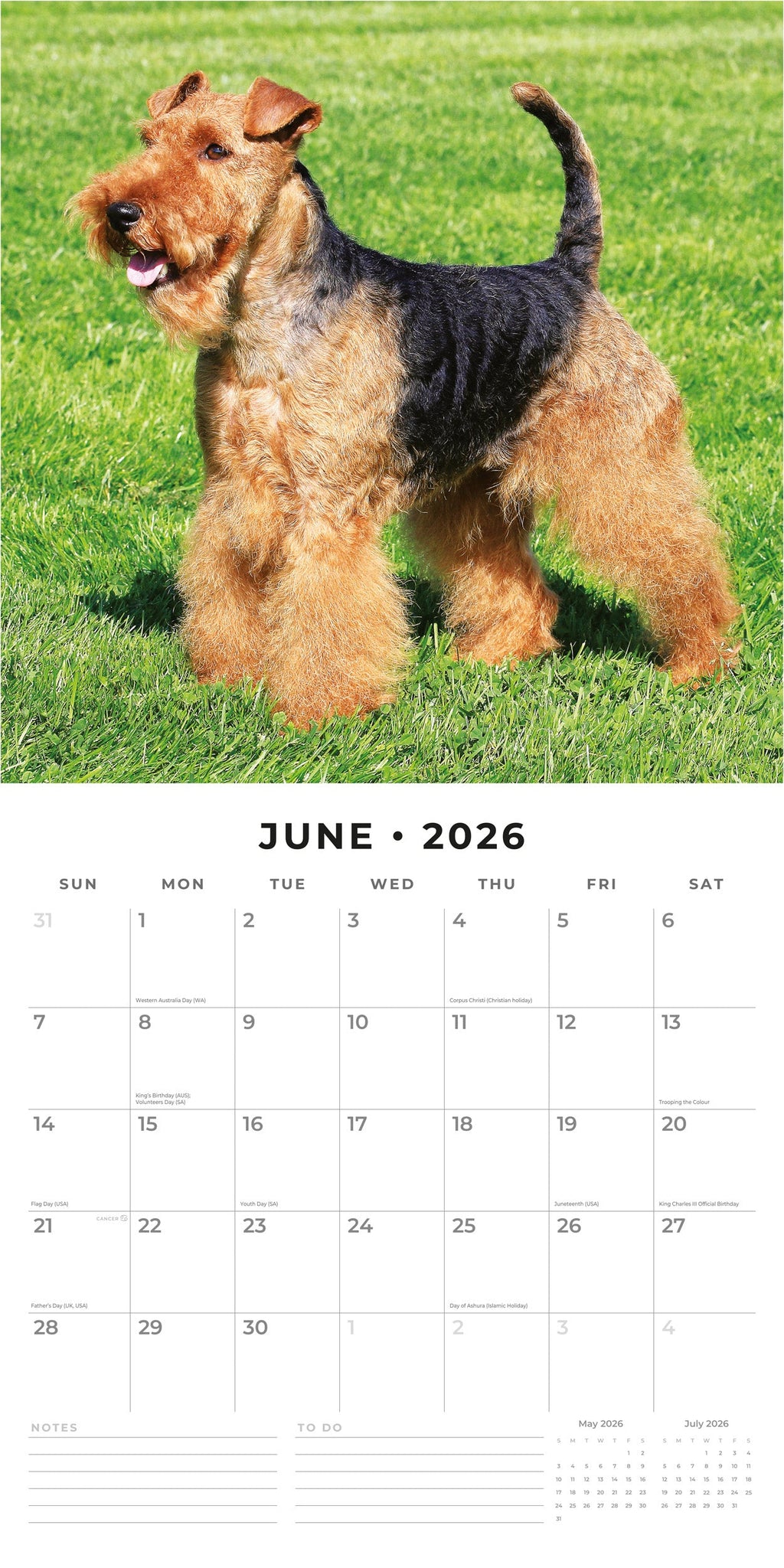 Packaged in a 100% plastic-free, sustainable, FSC-certified envelope, this 2026 Airedale Terriers Square Wall Calendar from Red Robin Publishing Ltd includes 12 months plus 4 bonus months, providing extended planning and a full year of enjoyment. .