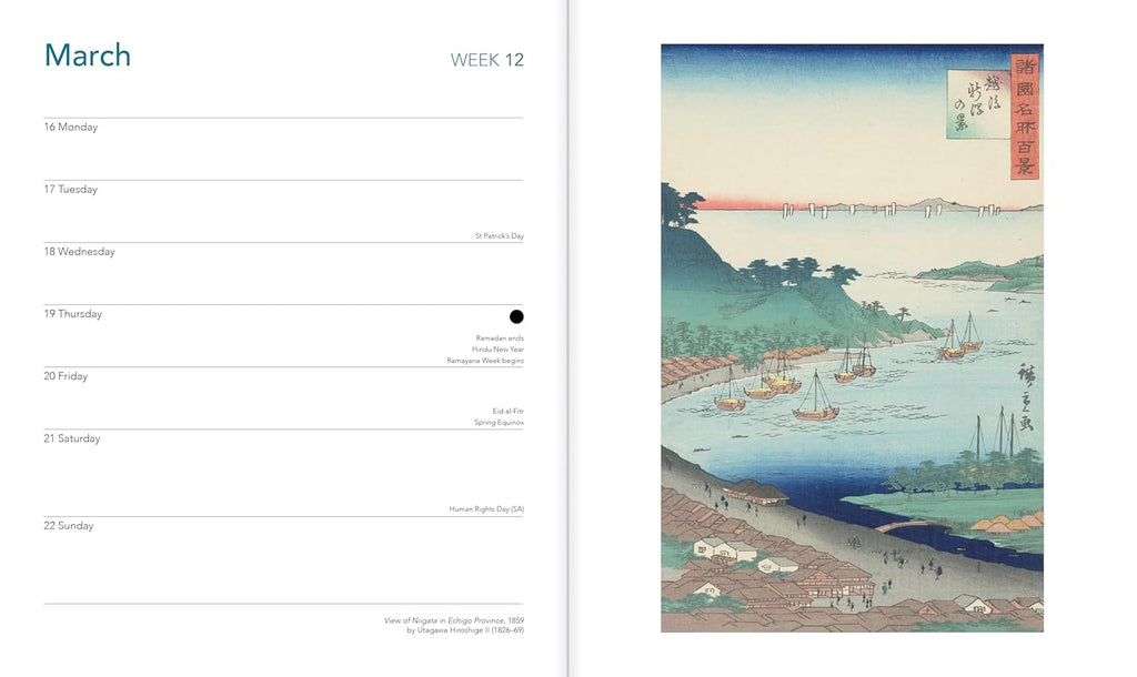 This desk diary is filled with a visually dazzling array of woodblock prints from masterful Japanese artists. The artworks feature dramatic rocky cliffs, natural beauty and mountainous landscapes, all created in a mesmerizing style and displayed with vibrant colours. Get a sense of their work with this week-to-view desk diary filled with their myriad prints. Printed on FSC-certified paper.