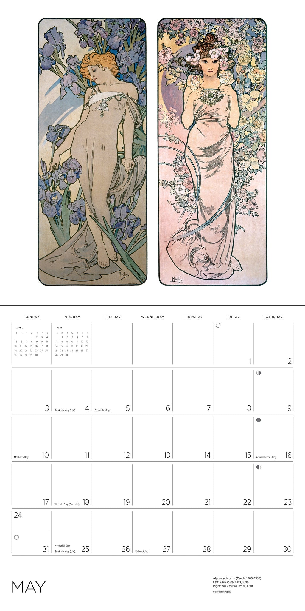 Alphonse Mucha's iconic linework gained widespread popularity in Paris at the close of the 19th century, becoming a hallmark of the Art Nouveau movement. His lithographs, advertising everything from chocolates to literary magazines, often featured glamorous women draped in flowing gowns and pastel florals. Mucha saw his work as art for the people, accessible to all, from modest homes to affluent circles. This calendar showcases some of his most stunning and beloved designs, which continue to captivate with their elegance and timeless appeal. .