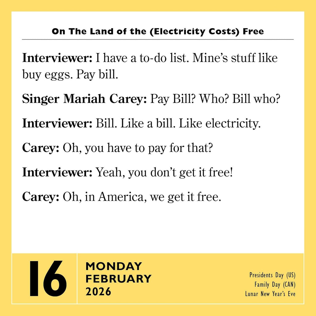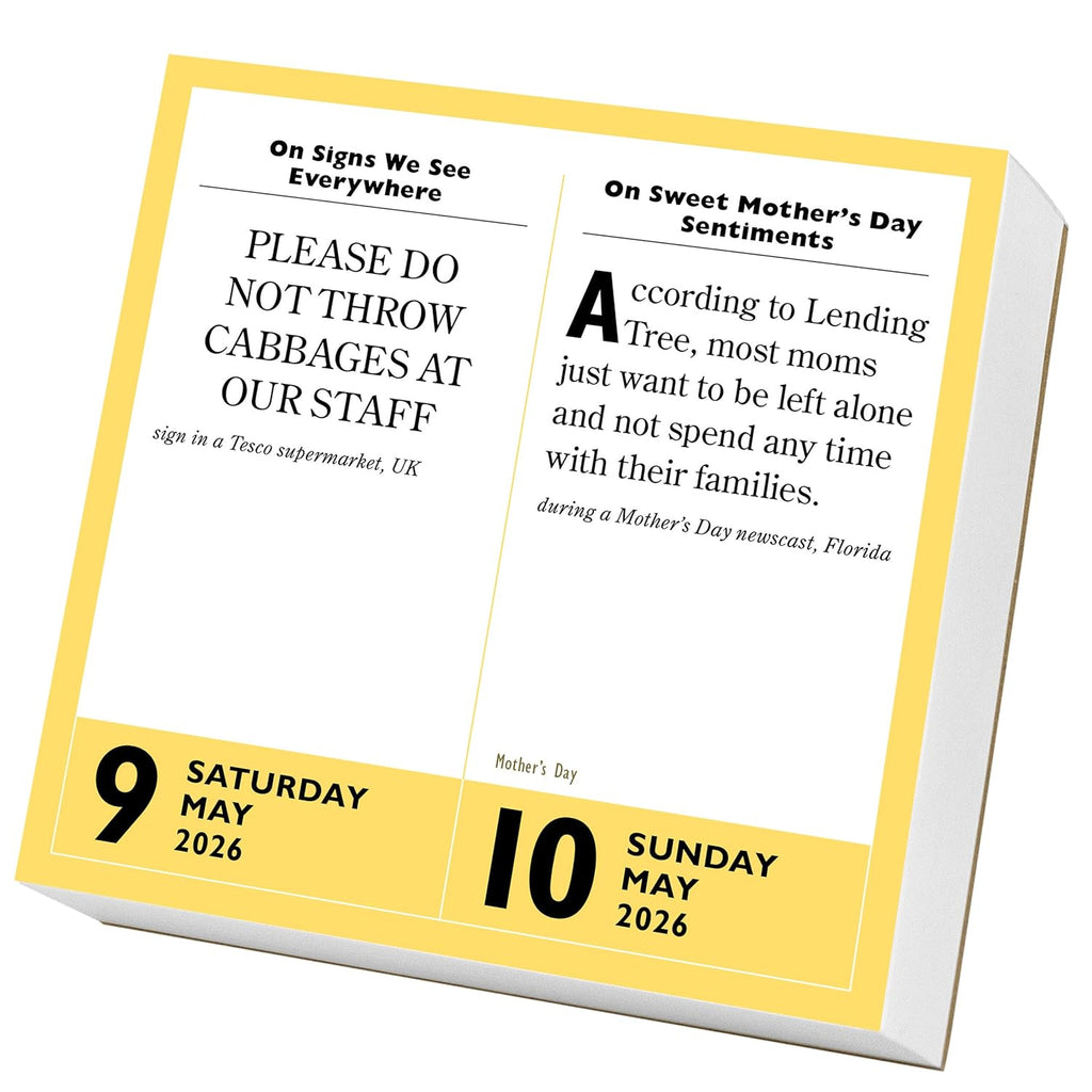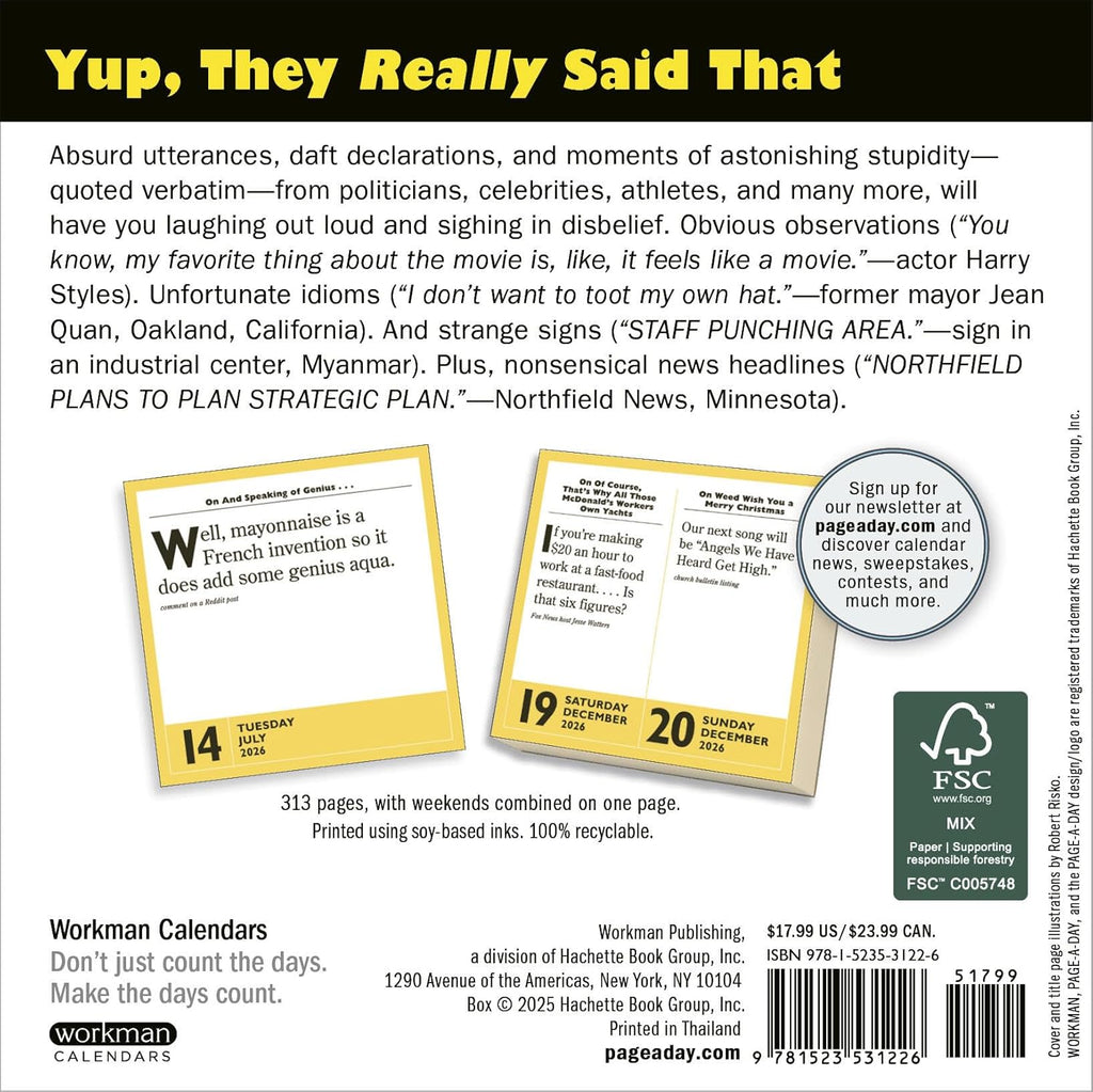 BAFFLING GAFFES AND FANTASTIC FUMBLES: This calendar provides your daily dose of absurdly asinine articulations, including statements from truth-challenged politicians, pointless 911 calls, what not to say in court, and hilarious headlines.