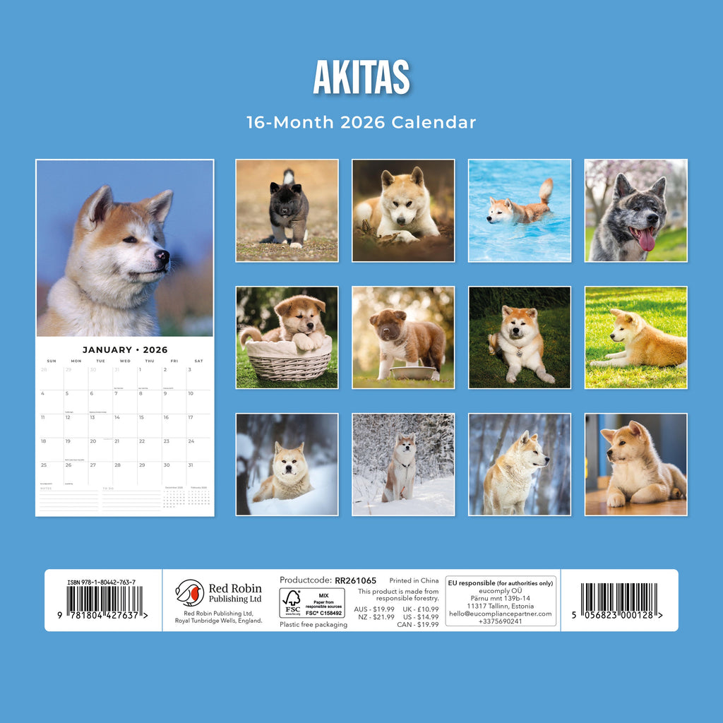 Packaged in a 100% plastic-free, sustainable, FSC-certified envelope, this 2026 Akitas Square Wall Calendar from Red Robin Publishing Ltd includes 12 months plus 4 bonus months, providing extended planning and a full year of enjoyment. .