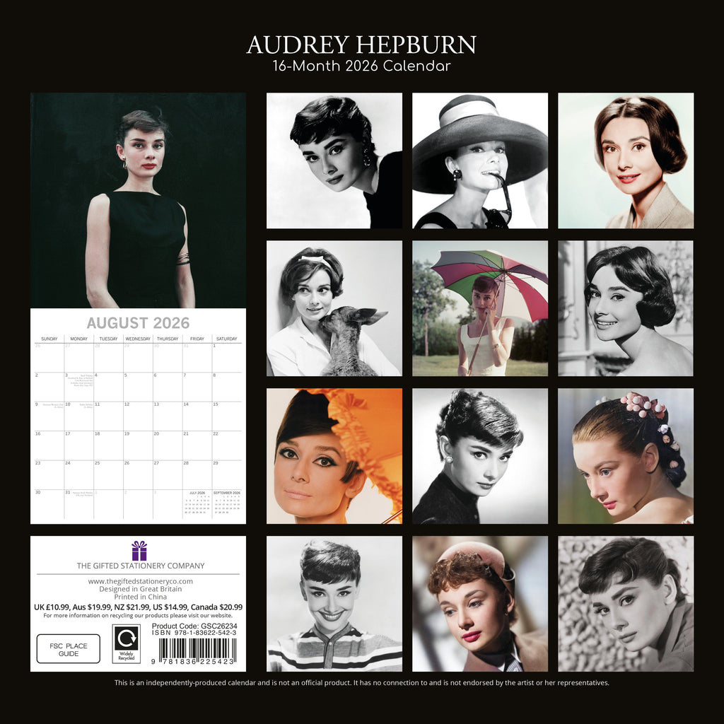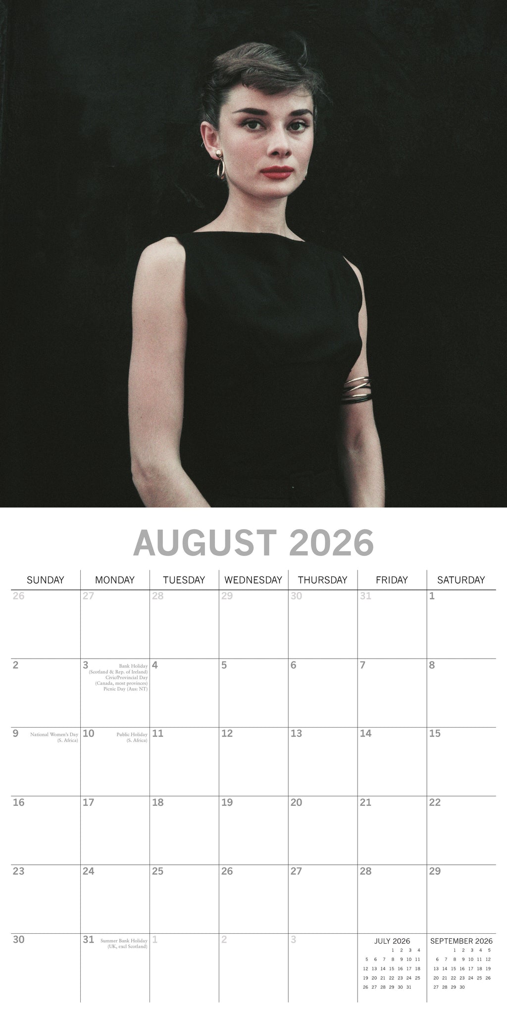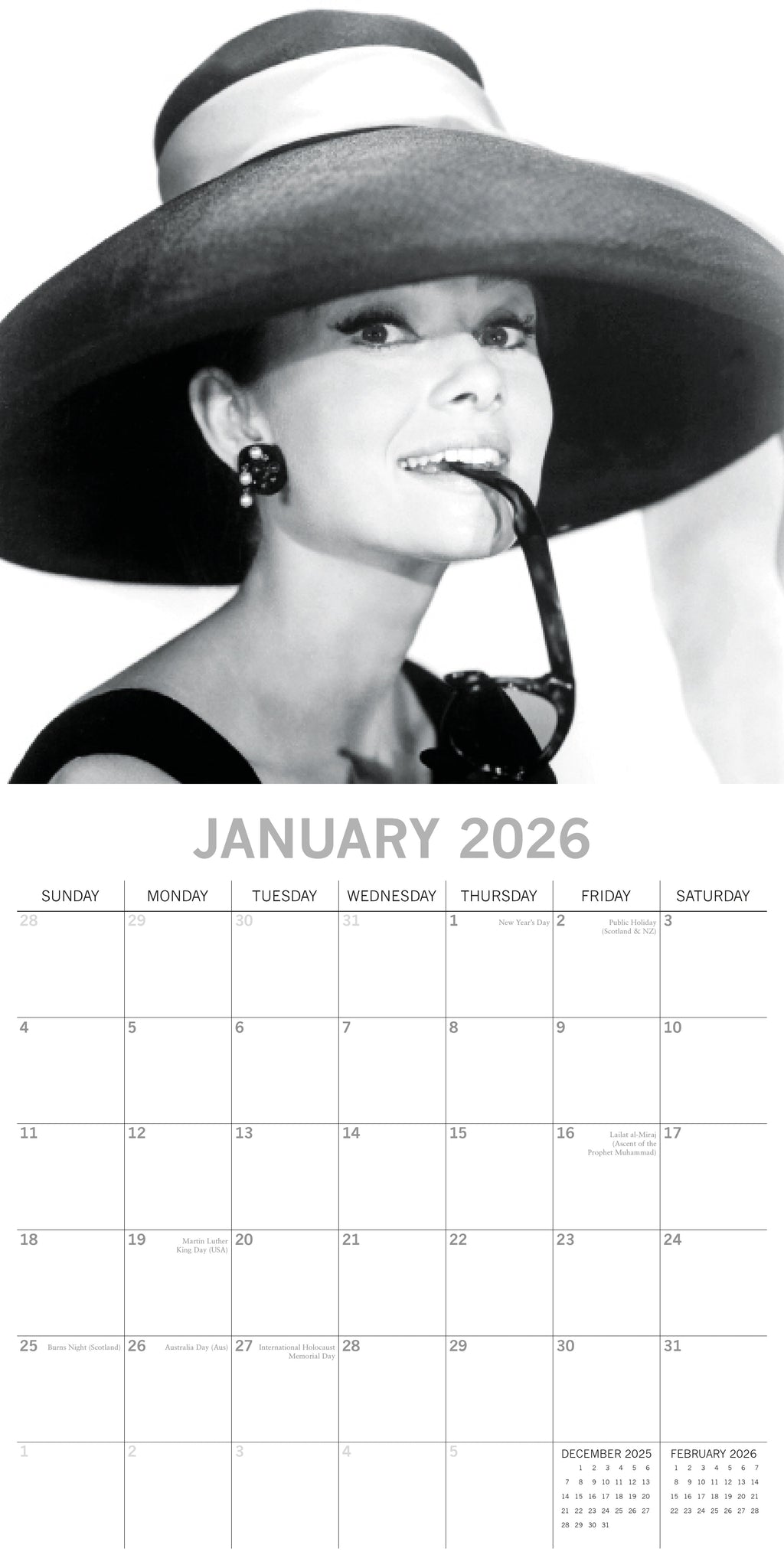 The 2026 Audrey Hepburn Square Wall Calendar spans 16 months—from September 2025 through December 2026—with the final four months of 2025 presented in a compact, mini-grid format. Each monthly spread begins on Sunday, with the top half showcasing a beautiful image and the bottom half featuring an easy-to-read monthly layout. The calendar comes shrink-wrapped for protection. .