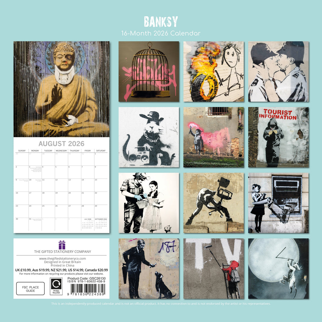 This exquisitely designed 2026 Banksy Square Wall Calendar from The Gifted Stationery Co. is ideal for your home or office and makes a thoughtful holiday gift for your loved ones. It features 13 stunning images of Banksy and includes large date grids for jotting down appointments, birthdays, and other important events. When opened, it measures 30 x 60 cm.