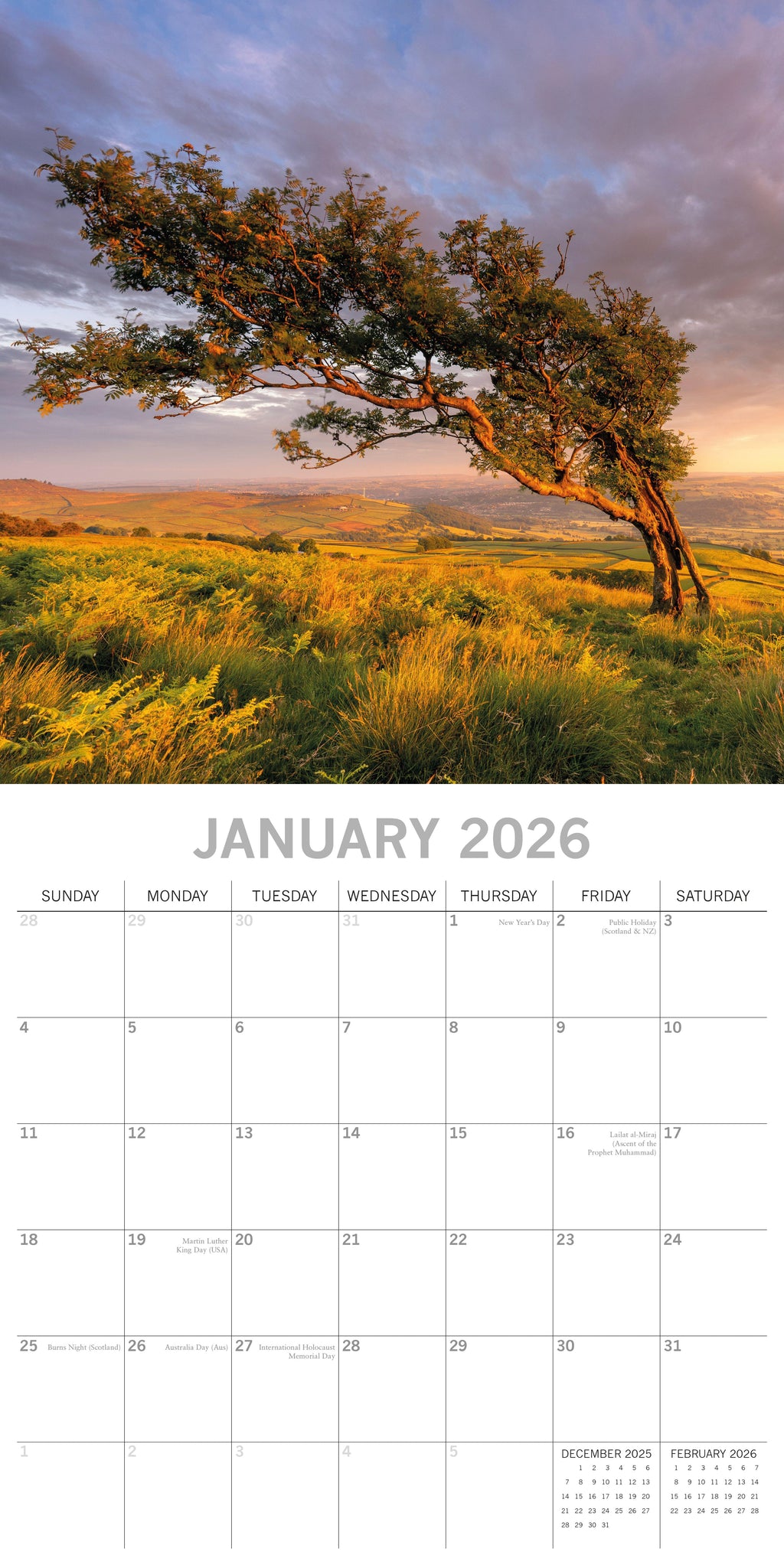 The 2026 Beauty of Trees Square Wall Calendar spans 16 months—from September 2025 through December 2026—with the final four months of 2025 presented in a compact, mini-grid format. Each monthly spread begins on Sunday, with the top half showcasing a beautiful image and the bottom half featuring an easy-to-read monthly layout. The calendar comes shrink-wrapped for protection. .