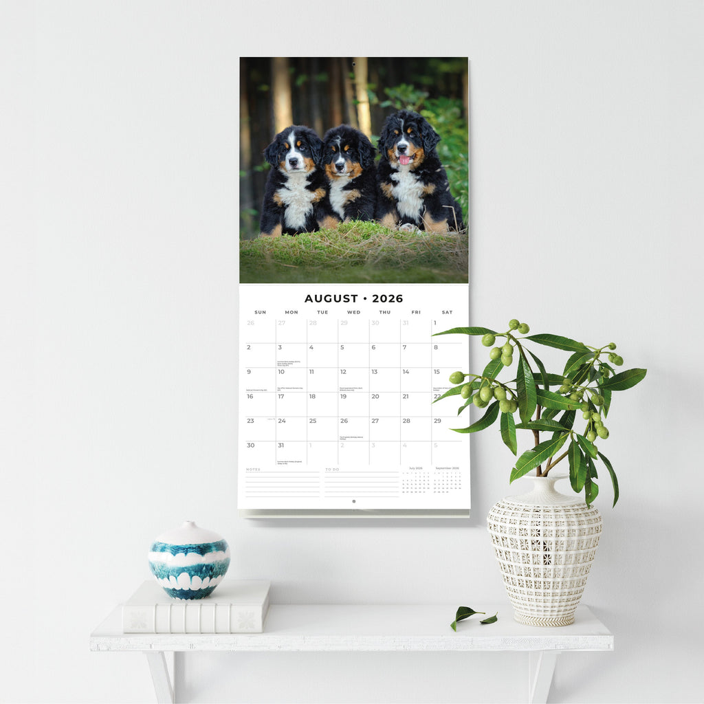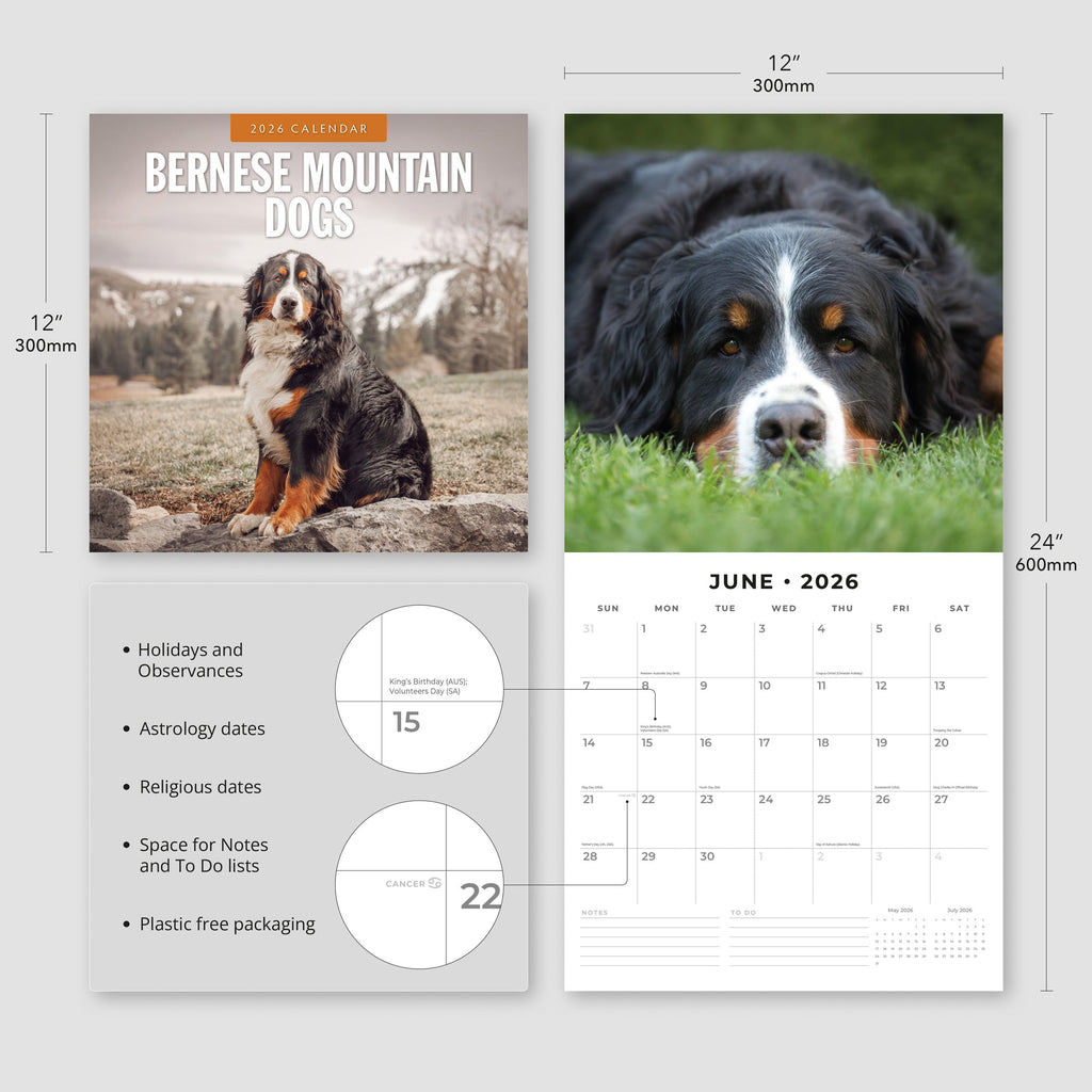 Packaged in a 100% plastic-free, sustainable, FSC-certified envelope, this 2026 Bernese Mountain Square Wall Calendar from Red Robin Publishing Ltd includes 12 months plus 4 bonus months, providing extended planning and a full year of enjoyment. .
