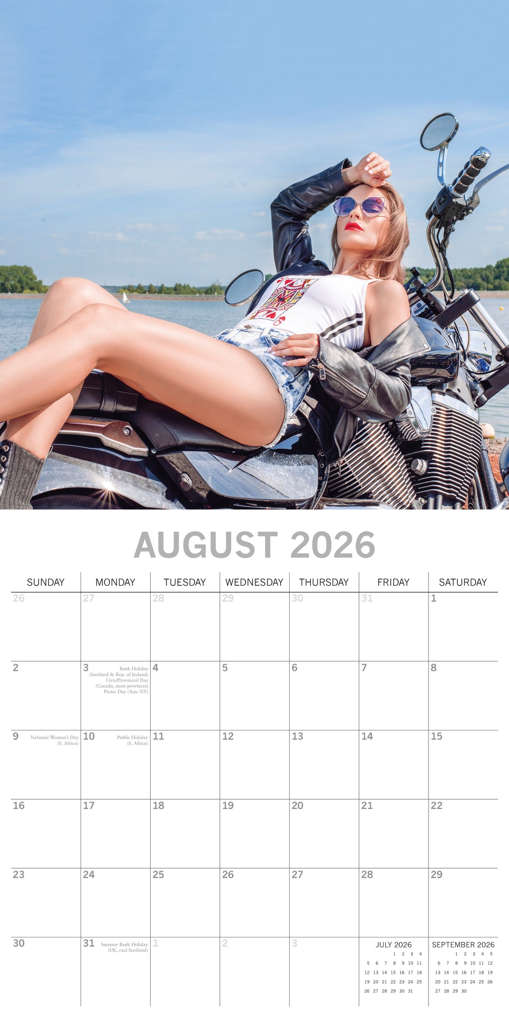 The 2026 Biker Babes Square Wall Calendar spans 16 months—from September 2025 through December 2026—with the final four months of 2025 presented in a compact, mini-grid format. Each monthly spread begins on Sunday, with the top half showcasing a beautiful image and the bottom half featuring an easy-to-read monthly layout. The calendar comes shrink-wrapped for protection. .