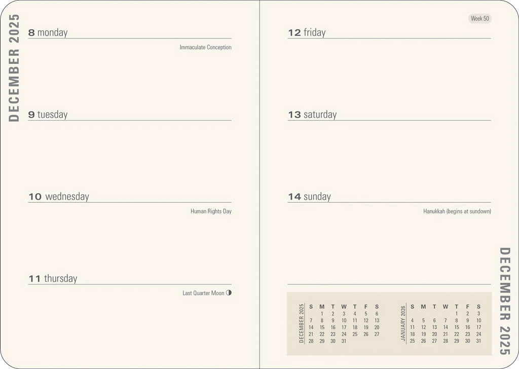 Weekly pages provide a 2-page spread with equal space for all 7 days.