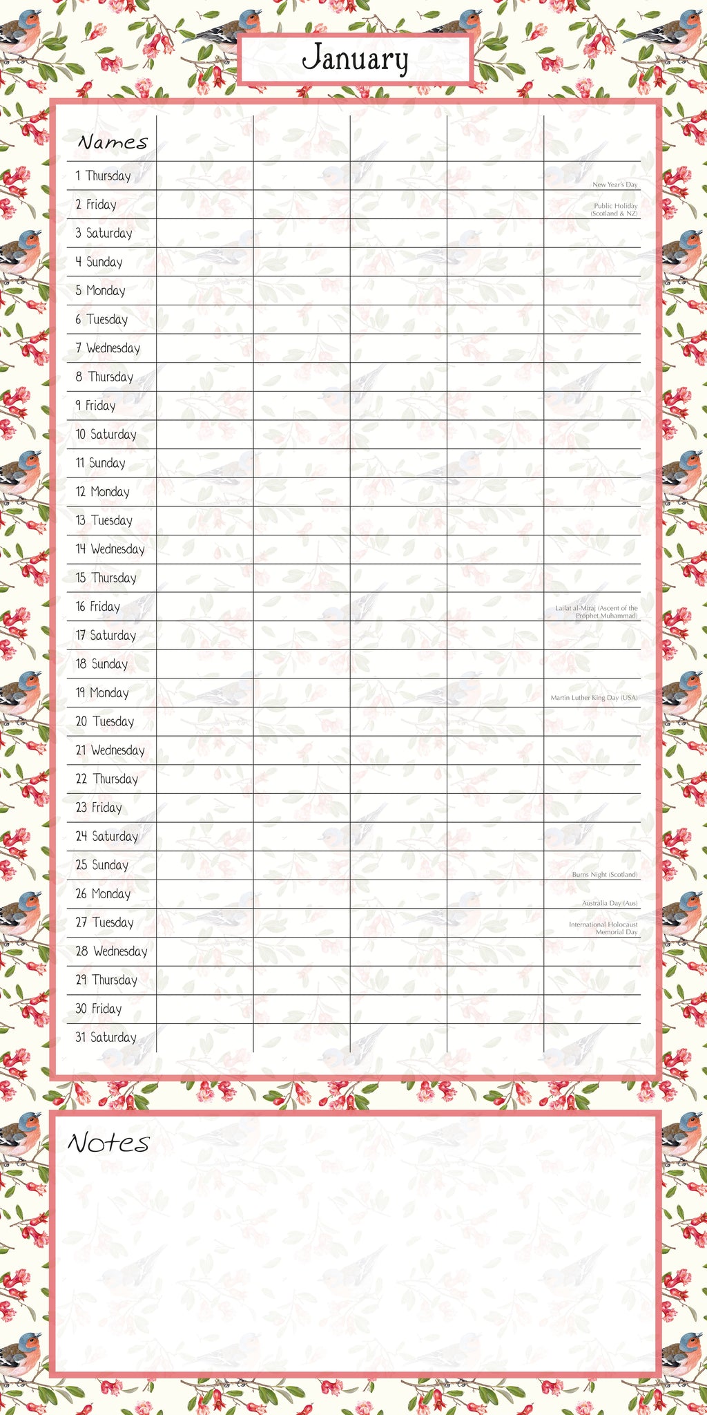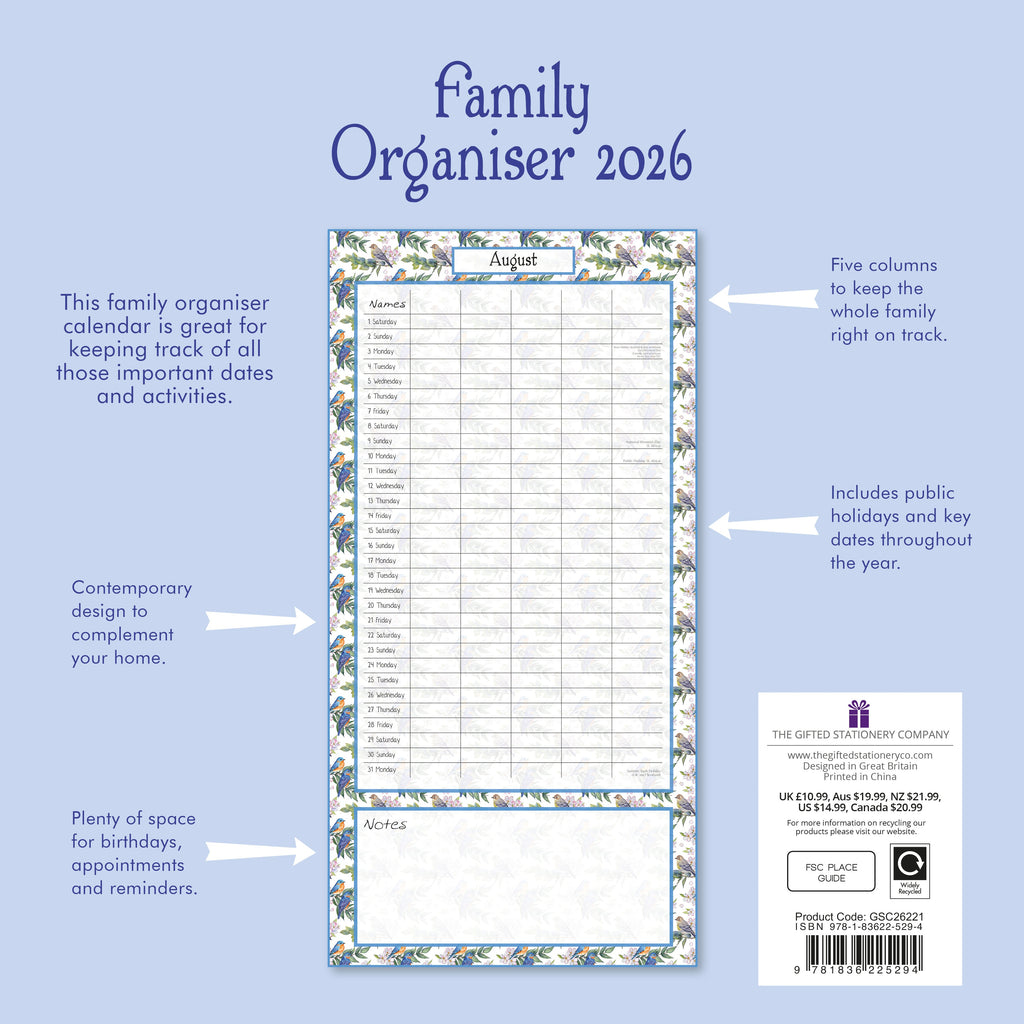 This exquisitely designed 2026 Birdsong Family Organiser Square Wall Calendar from The Gifted Stationery Co. is ideal for your home or office and makes a thoughtful holiday gift for your loved ones. It features 13 stunning images of Birdsong Family Organiser and includes large date grids for jotting down appointments, birthdays, and other important events. When opened, it measures 30 x 60 cm.