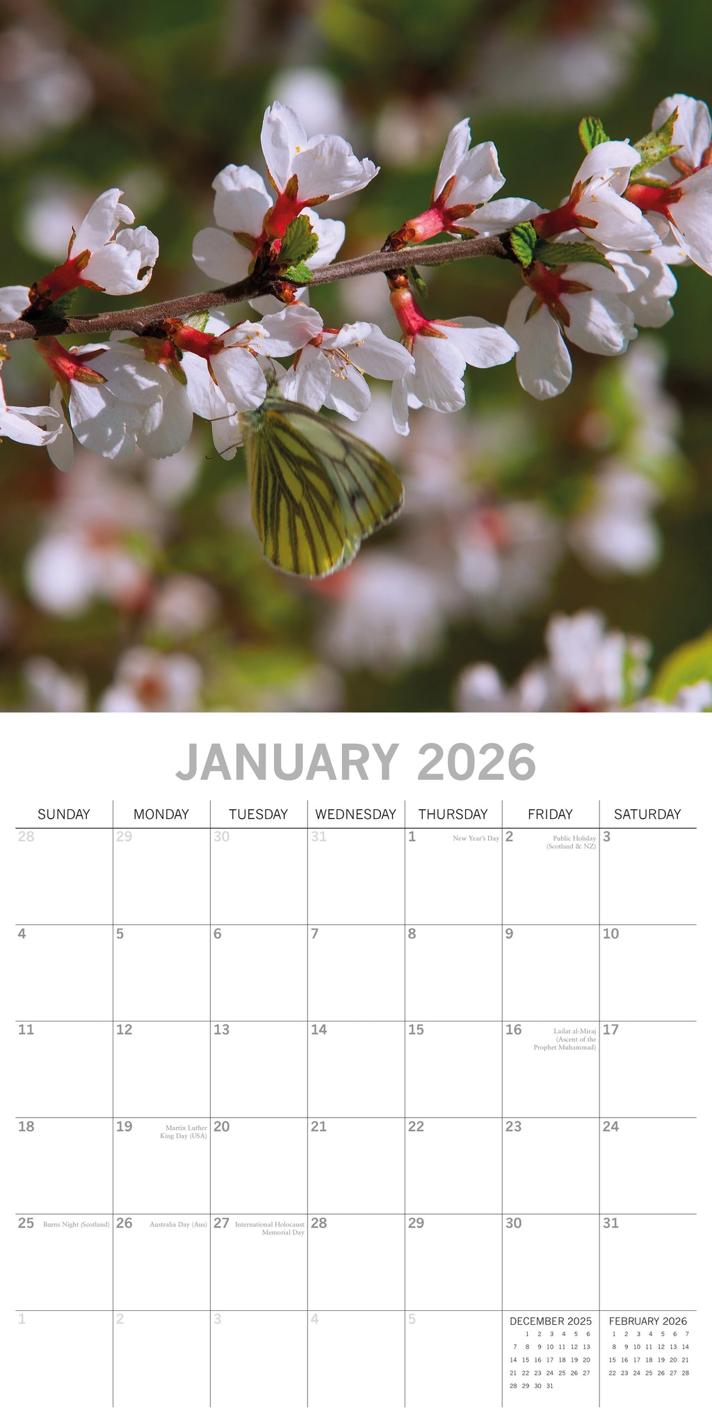 The 2026 Blossoms Square Wall Calendar spans 16 months—from September 2025 through December 2026—with the final four months of 2025 presented in a compact, mini-grid format. Each monthly spread begins on Sunday, with the top half showcasing a beautiful image and the bottom half featuring an easy-to-read monthly layout. The calendar comes shrink-wrapped for protection. .