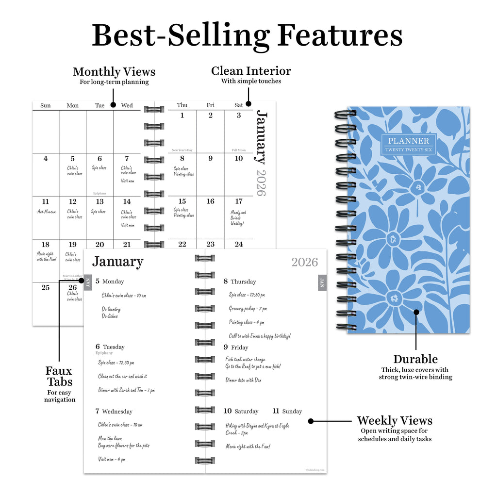 Keep your mind clear and your schedule organized with this straightforward 12 month 2026 planner with a pretty blue floral cover! Compact enough to fit in a pocket, handbag or backpack, the small weekly/monthly planner measures 3.5" (w) x 6.5" (h) and features monthly 2-page calendar grids for ample planning space. Weekly planning pages offer open spaces for detailed daily plans and faux tabs for quick reference. The durable cover has black wire-o binding to lay flat when open with bonus month views of September 2025 - December 2025 in the front and notes pages in the back. The monthly boxes measure .75" (w) x 1.25" (h). Spanning the months of January 2026 - December 2026, this product contains no plastic. Printed on FSC-certified paper.