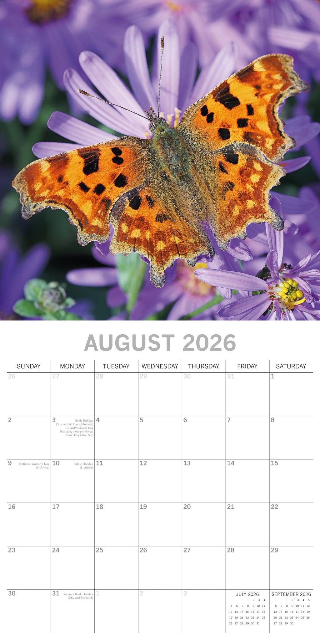 The 2026 Butterflies Square Wall Calendar spans 16 months—from September 2025 through December 2026—with the final four months of 2025 presented in a compact, mini-grid format. Each monthly spread begins on Sunday, with the top half showcasing a beautiful image and the bottom half featuring an easy-to-read monthly layout. The calendar comes shrink-wrapped for protection. .