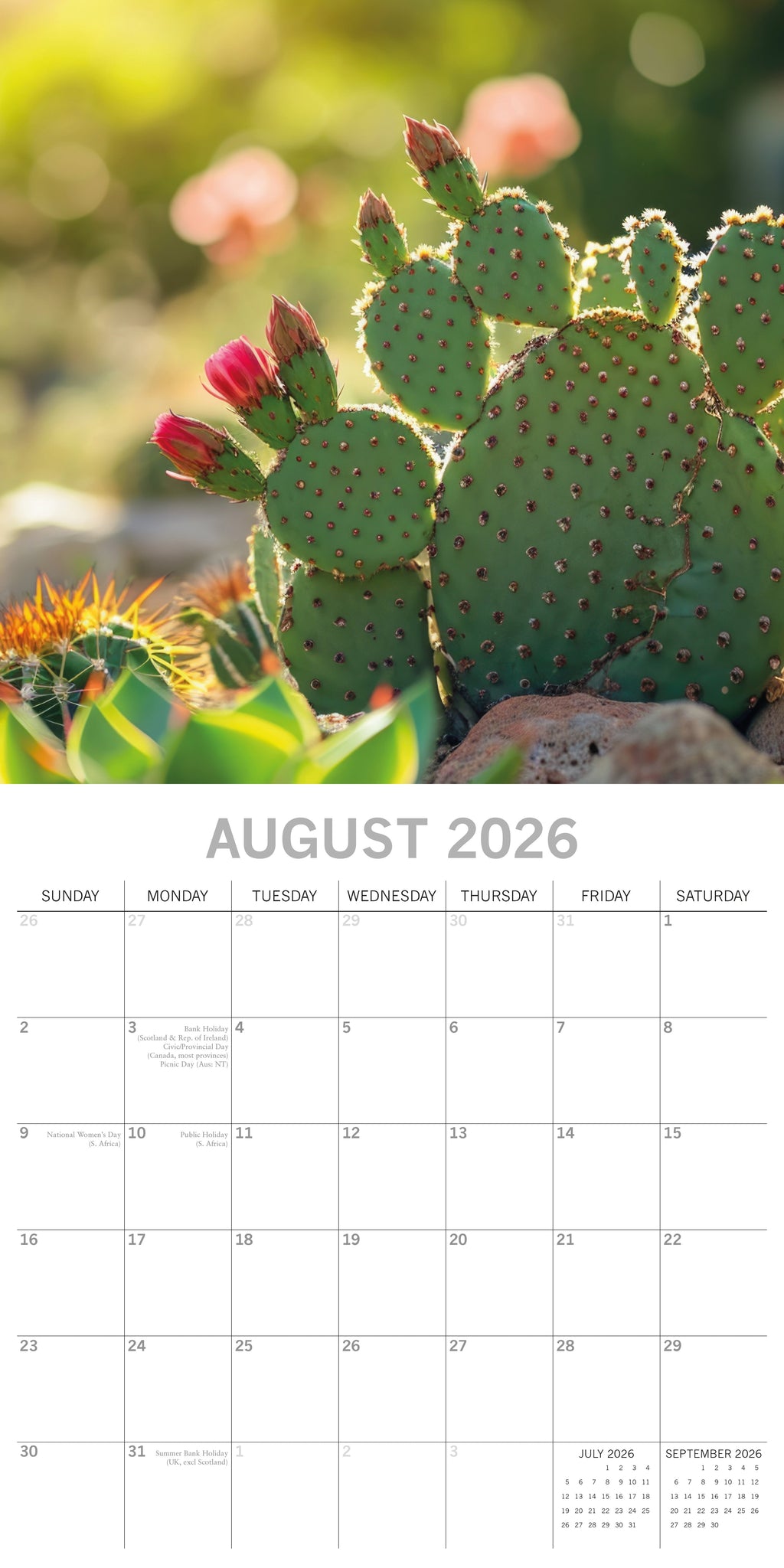The 2026 Cacti & Succulents Square Wall Calendar spans 16 months—from September 2025 through December 2026—with the final four months of 2025 presented in a compact, mini-grid format. Each monthly spread begins on Sunday, with the top half showcasing a beautiful image and the bottom half featuring an easy-to-read monthly layout. The calendar comes shrink-wrapped for protection. .
