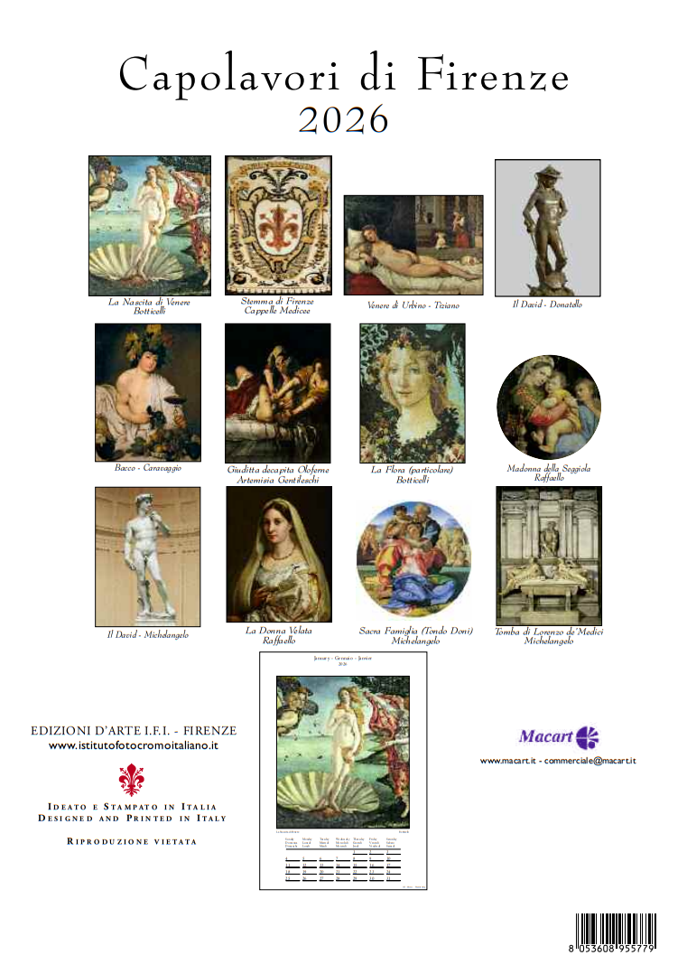 Discover FlorenceÕs masterpieces with the Capolavori di Firenze Ð 2026 Art Calendar. Each month features classic artwork that celebrates the cityÕs rich artistic heritage and timeless beauty.