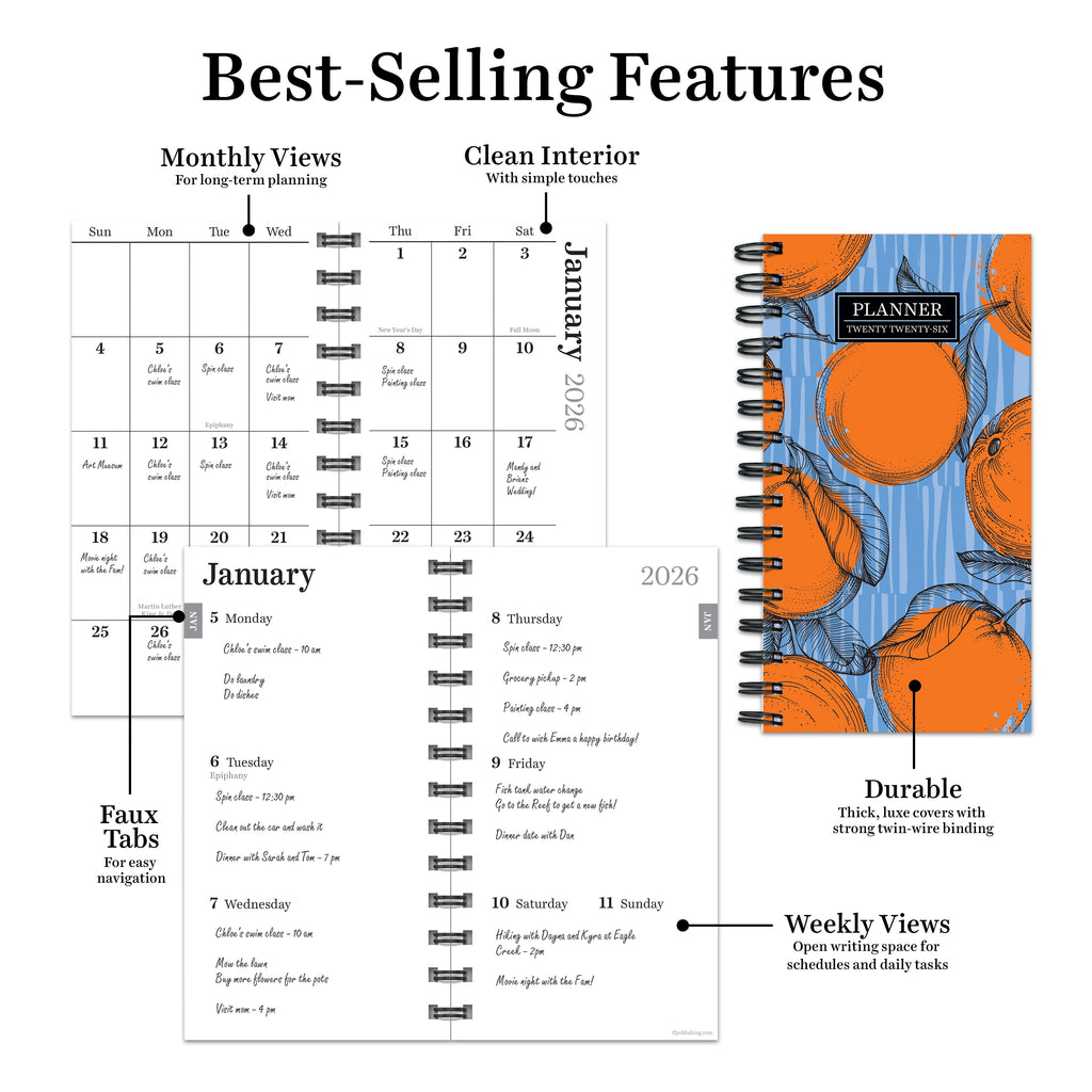 Keep your mind clear and your schedule organized with this straightforward 12 month 2026 planner with a fun citrus themed cover! Compact enough to fit in a pocket, handbag or backpack, the small weekly/monthly planner measures 3.5" (w) x 6.5" (h) and features monthly 2-page calendar grids for ample planning space. Weekly planning pages offer open spaces for detailed daily plans and faux tabs for quick reference. The durable cover has black wire-o binding to lay flat when open with bonus month views of September 2025 - December 2025 in the front and notes pages in the back. The monthly boxes measure .75" (w) x 1.25" (h). Spanning the months of January 2026 - December 2026, this product contains no plastic. Printed on FSC-certified paper.