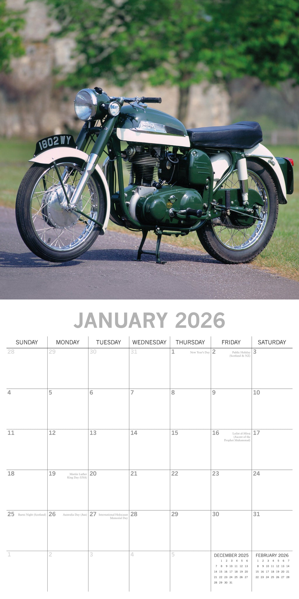 The 2026 Classic Bikes Square Wall Calendar spans 16 months—from September 2025 through December 2026—with the final four months of 2025 presented in a compact, mini-grid format. Each monthly spread begins on Sunday, with the top half showcasing a beautiful image and the bottom half featuring an easy-to-read monthly layout. The calendar comes shrink-wrapped for protection. .