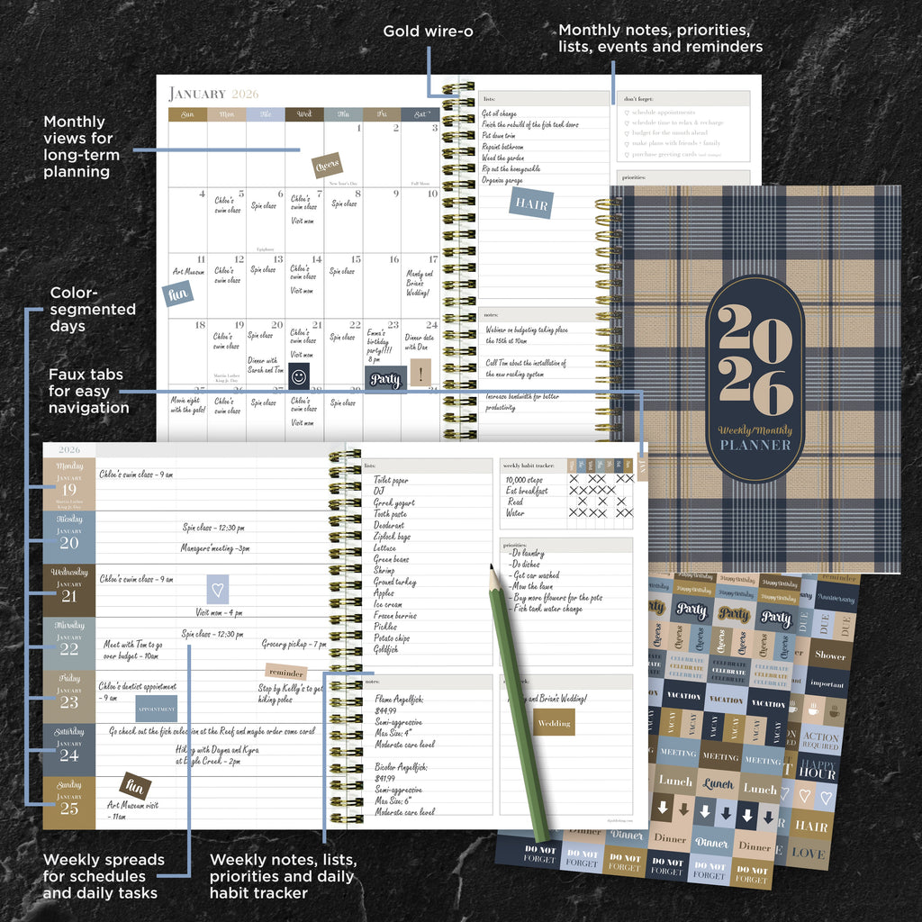 You'll be mad for plaid with our medium weekly monthly planner featuring a spohistocated plaid cover design! Measuring 6.5" (w) x 8" (h), the all-encompassing planner boasts 2-page monthly spreads that include lined sections for notes, tasks, and goals and 2-page weekly spreads with lined daily sections to keep plans neat and organized. Plus, a dedicated weekly priorities section to help you stay focused! The interior pages are designed with a light and airy feel, accented with faux monthly tabs for easy access to weekly planning. Enhance your daily plans with 216 color coordinating stickers to highlight special occasions and personalize your planner. Bonus lined notes pages are in the back with yearly 2026 and 2026 views in the front. The monthly boxes measure .75" (w) x 1.3" (h). Featuring a durable cover and gold wire-o binding designed to lay flat when open, this 12-month planner covers January 2026 – December 2026 and includes a plastic free cover and is fully recyclable! Printed on FSC-certified paper.