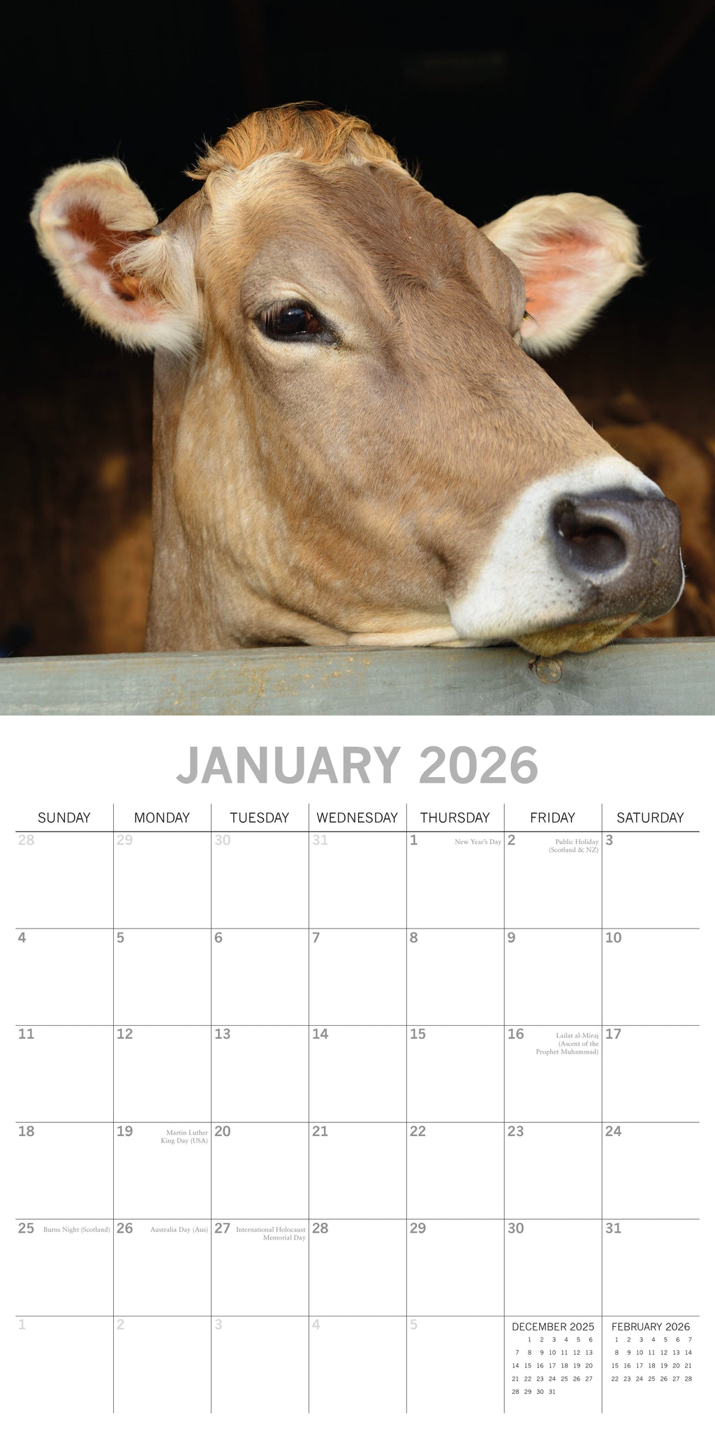 The 2026 Cows Square Wall Calendar spans 16 months—from September 2025 through December 2026—with the final four months of 2025 presented in a compact, mini-grid format. Each monthly spread begins on Sunday, with the top half showcasing a beautiful image and the bottom half featuring an easy-to-read monthly layout. The calendar comes shrink-wrapped for protection. .