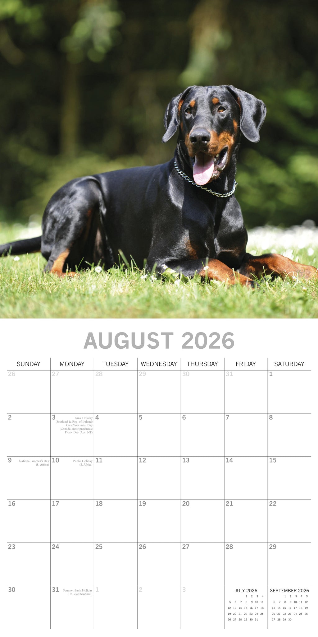The 2026 Dobermans Square Wall Calendar spans 16 months—from September 2025 through December 2026—with the final four months of 2025 presented in a compact, mini-grid format. Each monthly spread begins on Sunday, with the top half showcasing a beautiful image and the bottom half featuring an easy-to-read monthly layout. The calendar comes shrink-wrapped for protection. .