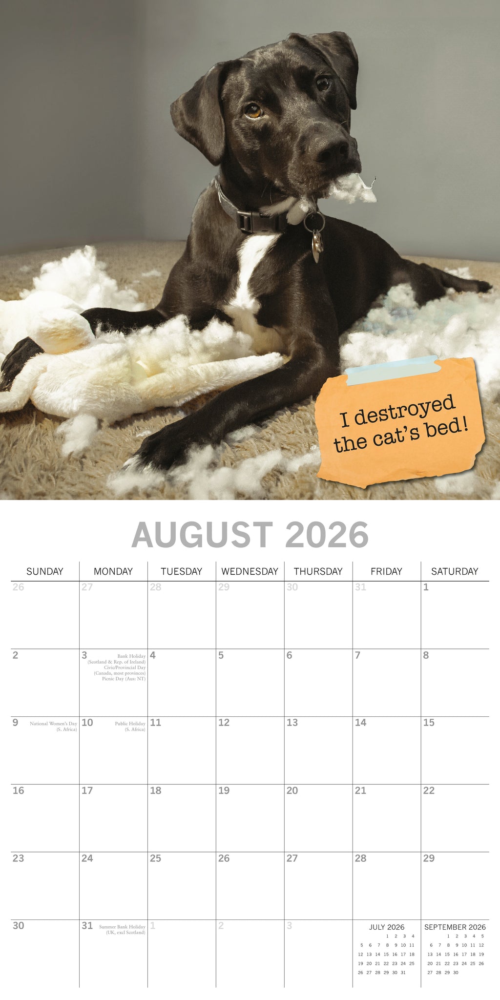 The 2026 Dog Shaming Square Wall Calendar spans 16 months—from September 2025 through December 2026—with the final four months of 2025 presented in a compact, mini-grid format. Each monthly spread begins on Sunday, with the top half showcasing a beautiful image and the bottom half featuring an easy-to-read monthly layout. The calendar comes shrink-wrapped for protection. .