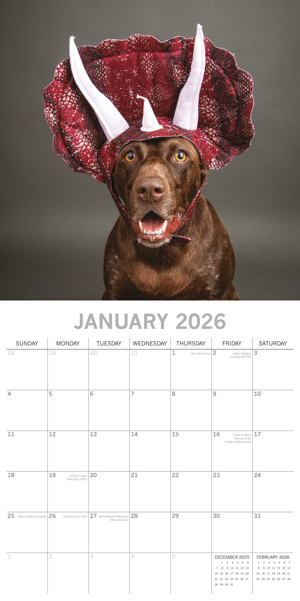 The 2026 Dogs as Animals Square Wall Calendar spans 16 months—from September 2025 through December 2026—with the final four months of 2025 presented in a compact, mini-grid format. Each monthly spread begins on Sunday, with the top half showcasing a beautiful image and the bottom half featuring an easy-to-read monthly layout. The calendar comes shrink-wrapped for protection. .