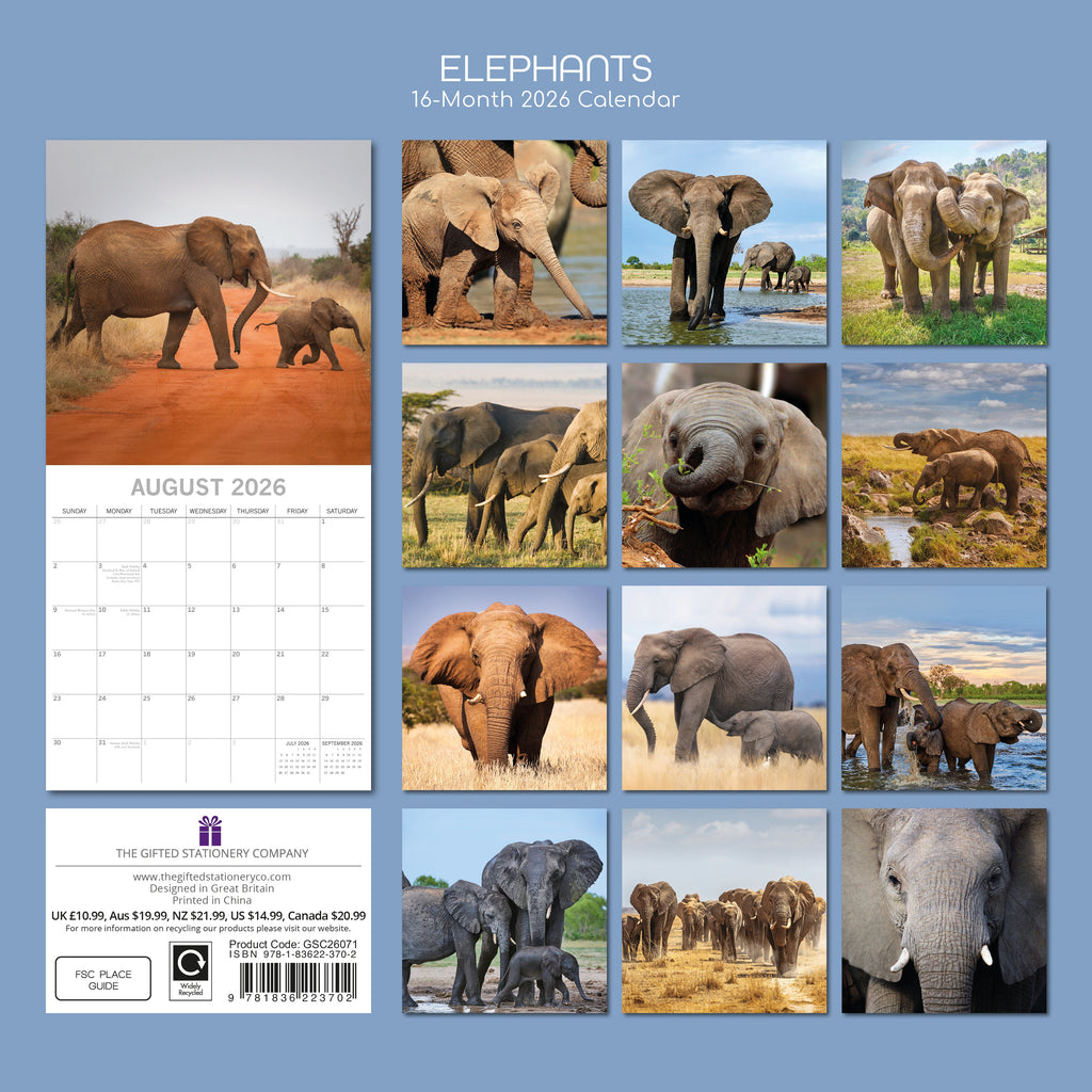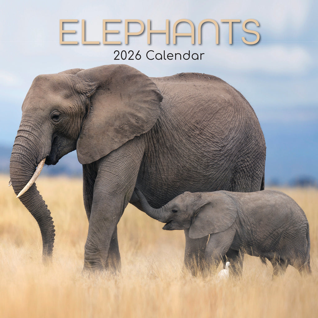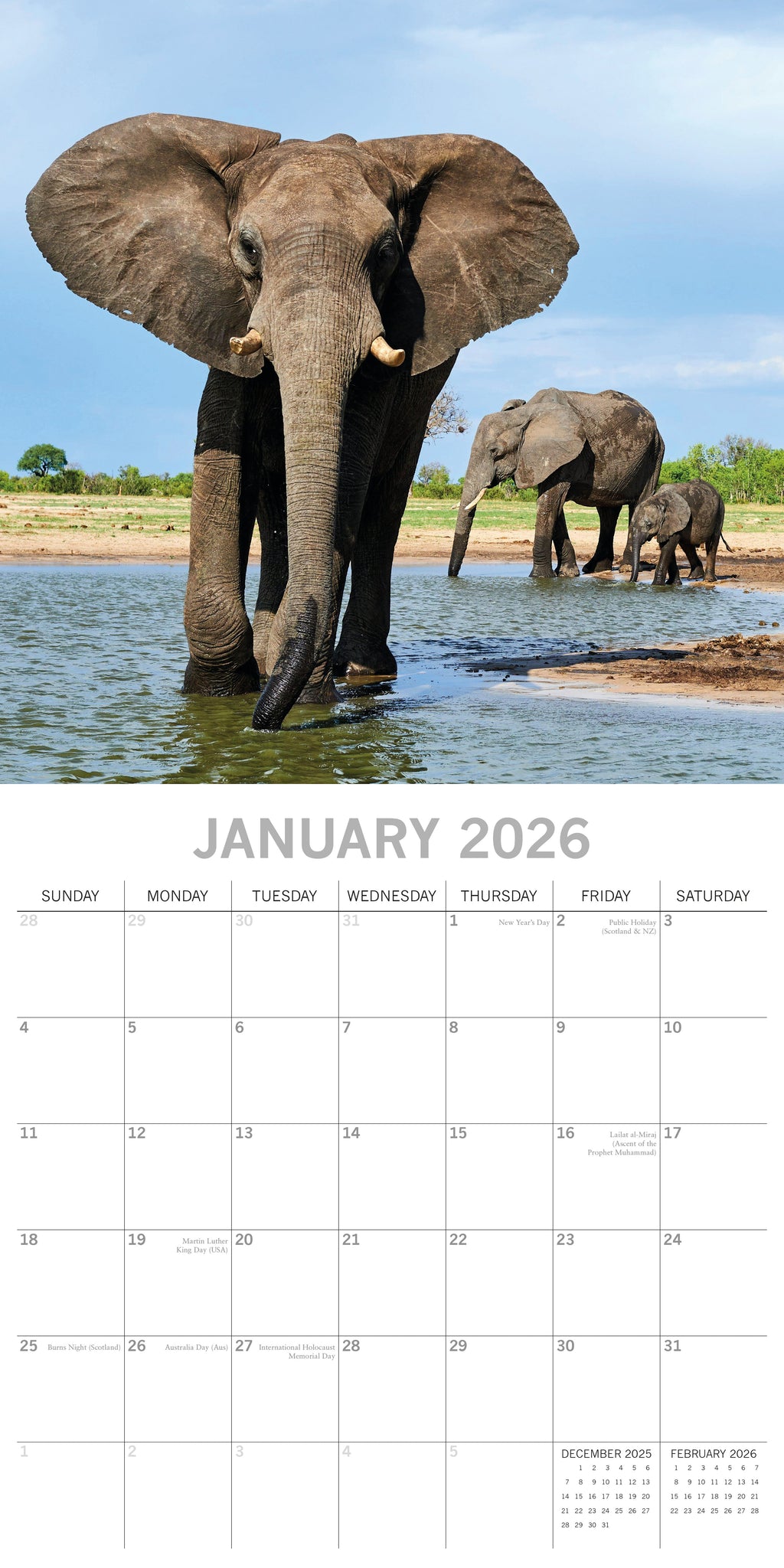 The 2026 Elephants Square Wall Calendar spans 16 months—from September 2025 through December 2026—with the final four months of 2025 presented in a compact, mini-grid format. Each monthly spread begins on Sunday, with the top half showcasing a beautiful image and the bottom half featuring an easy-to-read monthly layout. The calendar comes shrink-wrapped for protection. .
