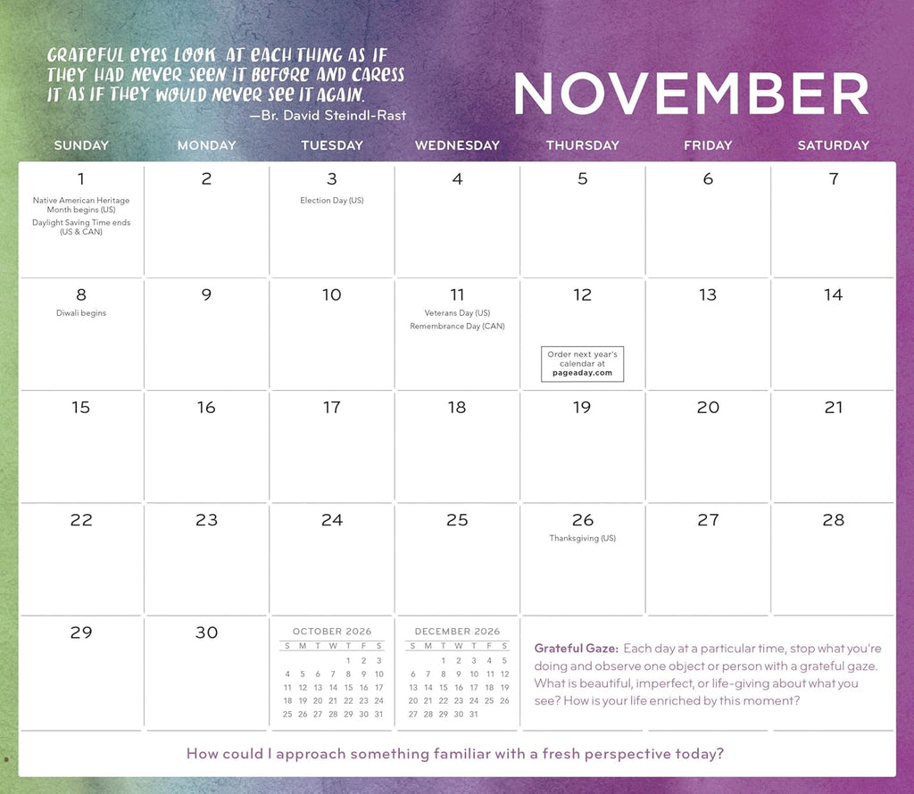 PURPOSEFUL PRACTICES: Gratitude Practices appear throughout the calendar to help you exercise your thankfulness: Each day at a particular time, stop what you're doing and observe one object of person with a grateful gaze.