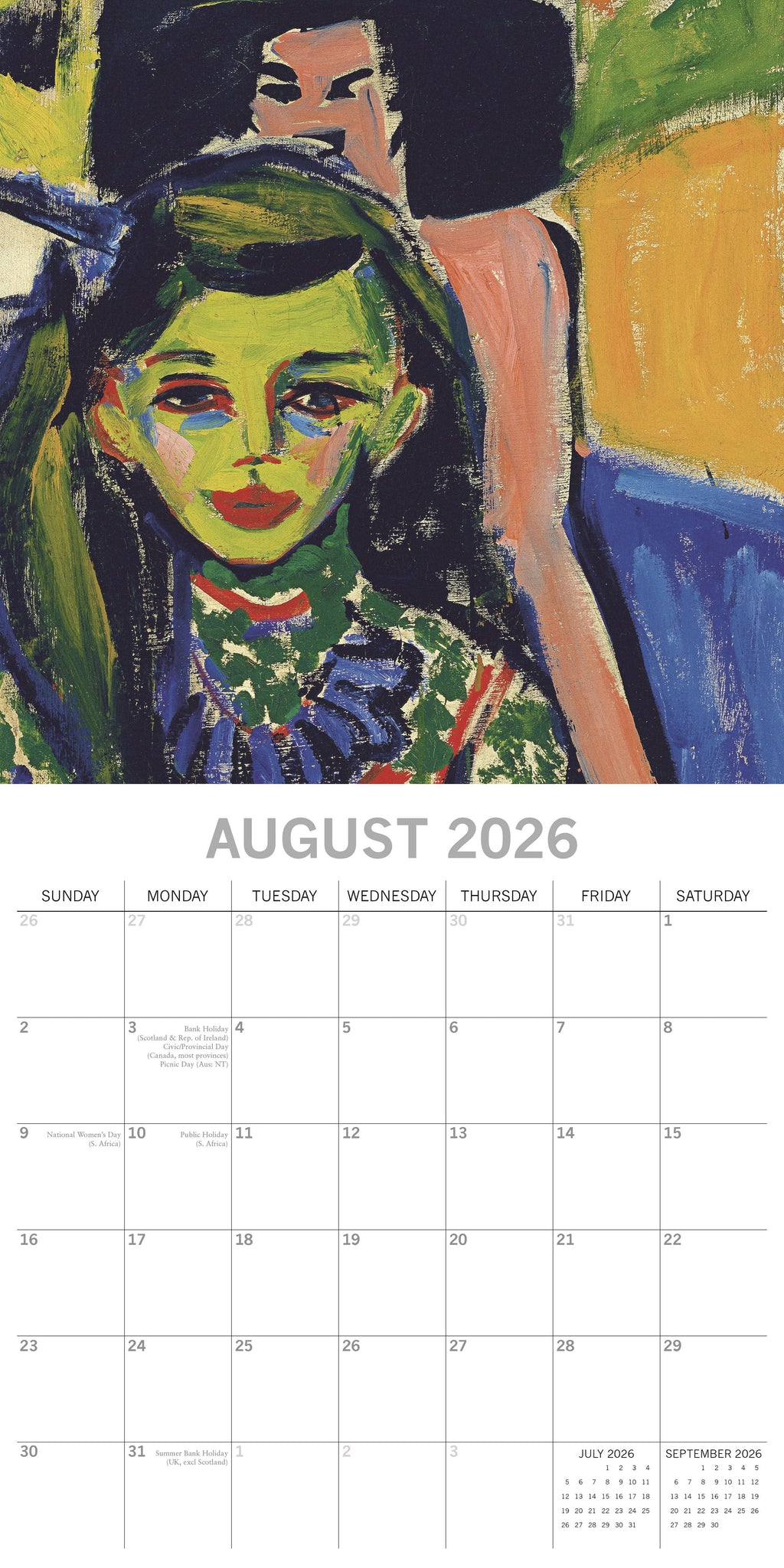 The 2026 Expressionists Square Wall Calendar spans 16 months—from September 2025 through December 2026—with the final four months of 2025 presented in a compact, mini-grid format. Each monthly spread begins on Sunday, with the top half showcasing a beautiful image and the bottom half featuring an easy-to-read monthly layout. The calendar comes shrink-wrapped for protection. .