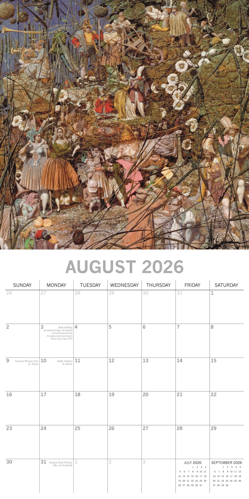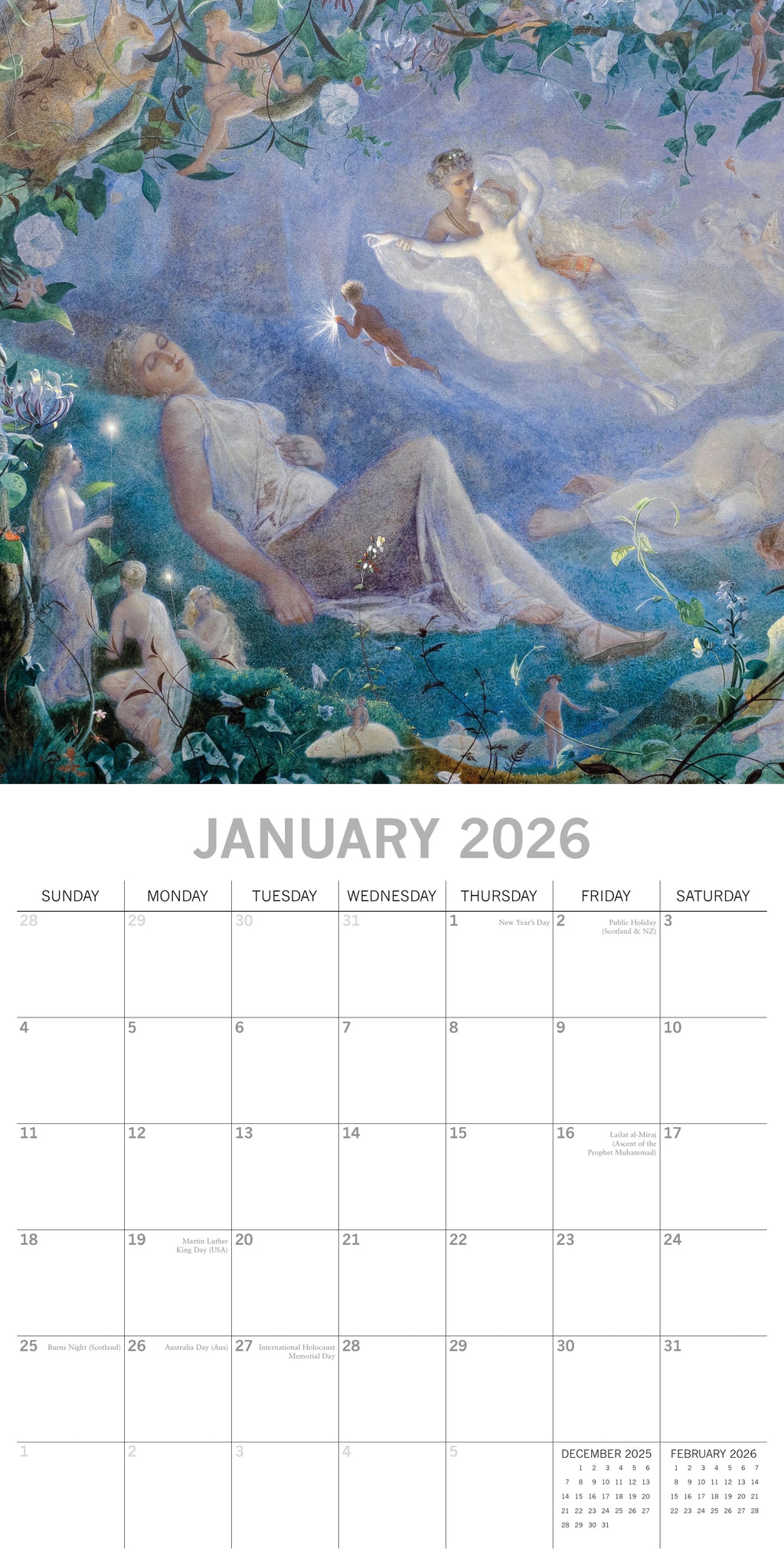 The 2026 Fairies Square Wall Calendar spans 16 months—from September 2025 through December 2026—with the final four months of 2025 presented in a compact, mini-grid format. Each monthly spread begins on Sunday, with the top half showcasing a beautiful image and the bottom half featuring an easy-to-read monthly layout. The calendar comes shrink-wrapped for protection. .