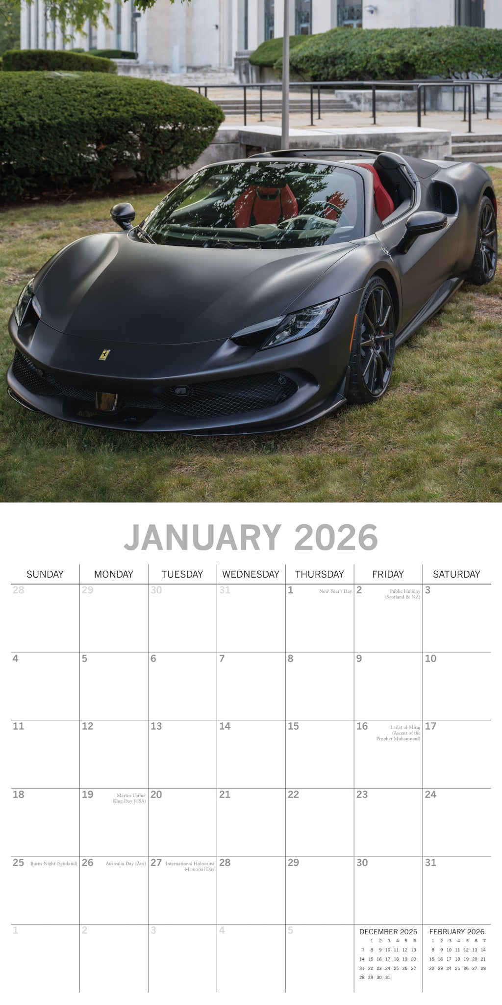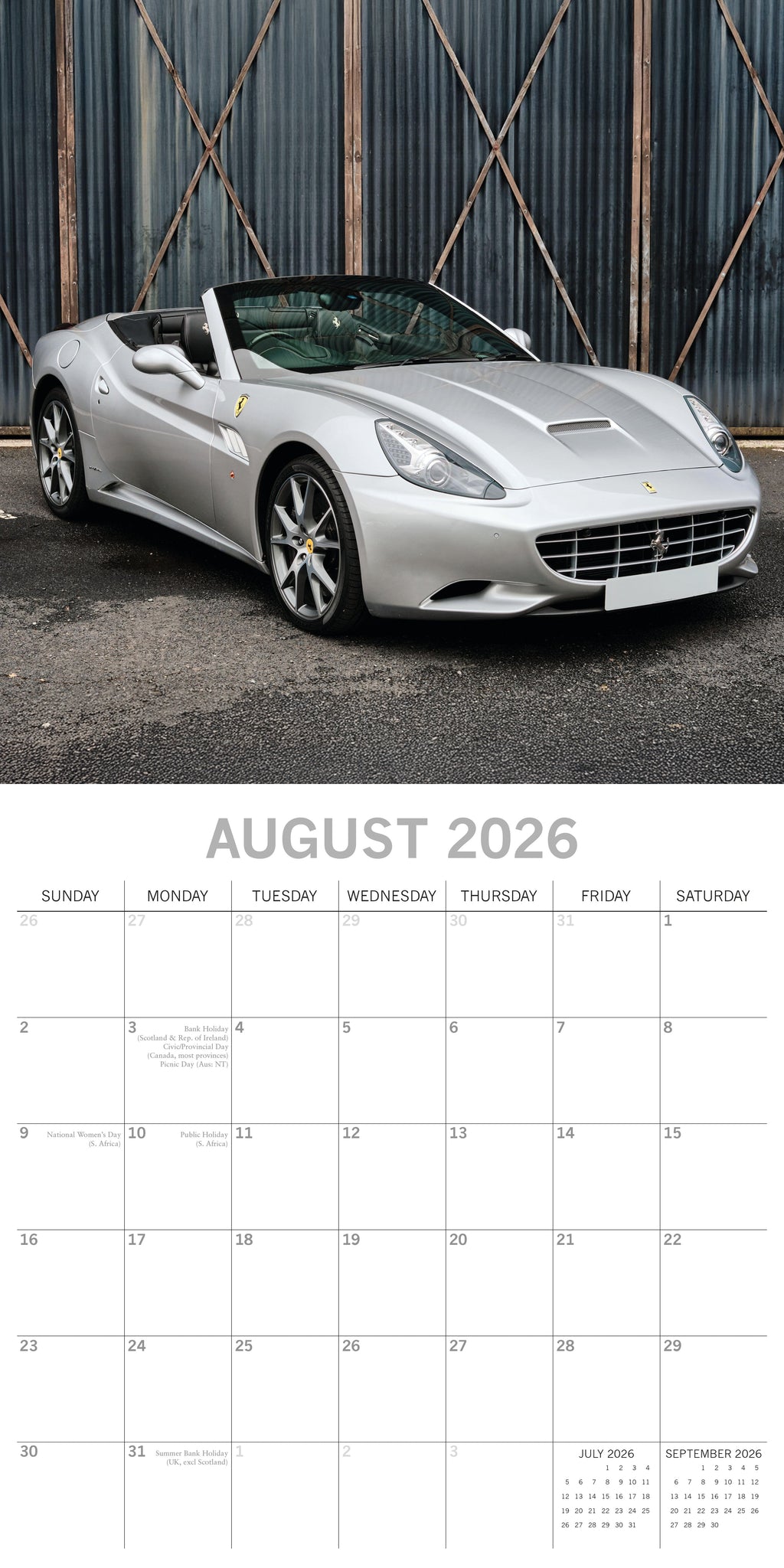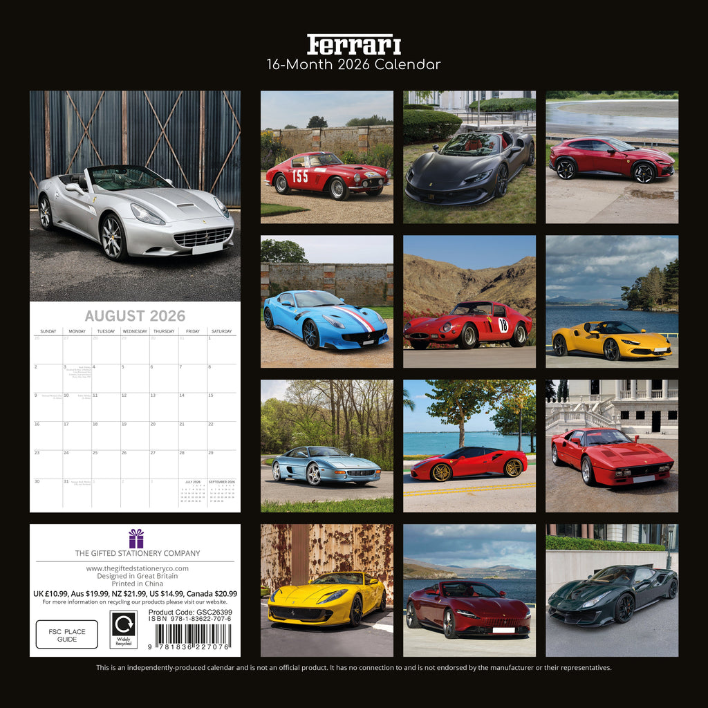 The 2026 Ferrari Square Wall Calendar spans 16 months—from September 2025 through December 2026—with the final four months of 2025 presented in a compact, mini-grid format. Each monthly spread begins on Sunday, with the top half showcasing a beautiful image and the bottom half featuring an easy-to-read monthly layout. The calendar comes shrink-wrapped for protection. .