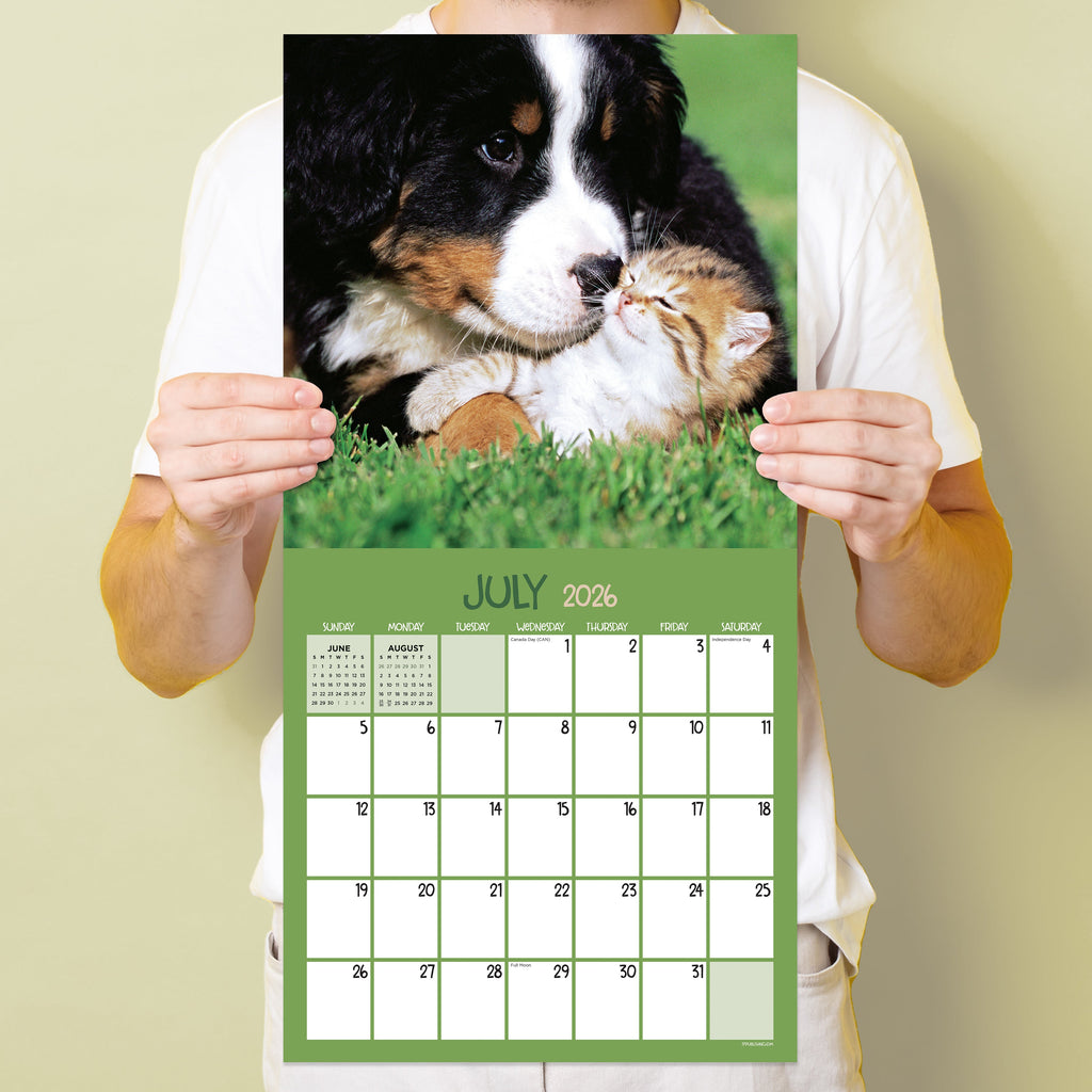 Proving that friendship knows no boundaries, our Furry Friends calendar highlights unlikely pairs being adorable together! This 2026 12-month wall calendar measures 12" x 12" (12" x 24" open) and includes thirteen full-color images combined with monthly calendar grids and a bonus 4-month view of January 2027 - April 2027. The wall calendar spans January 2026 - December 2026 and is printed on FSC-certified premium gloss paper.