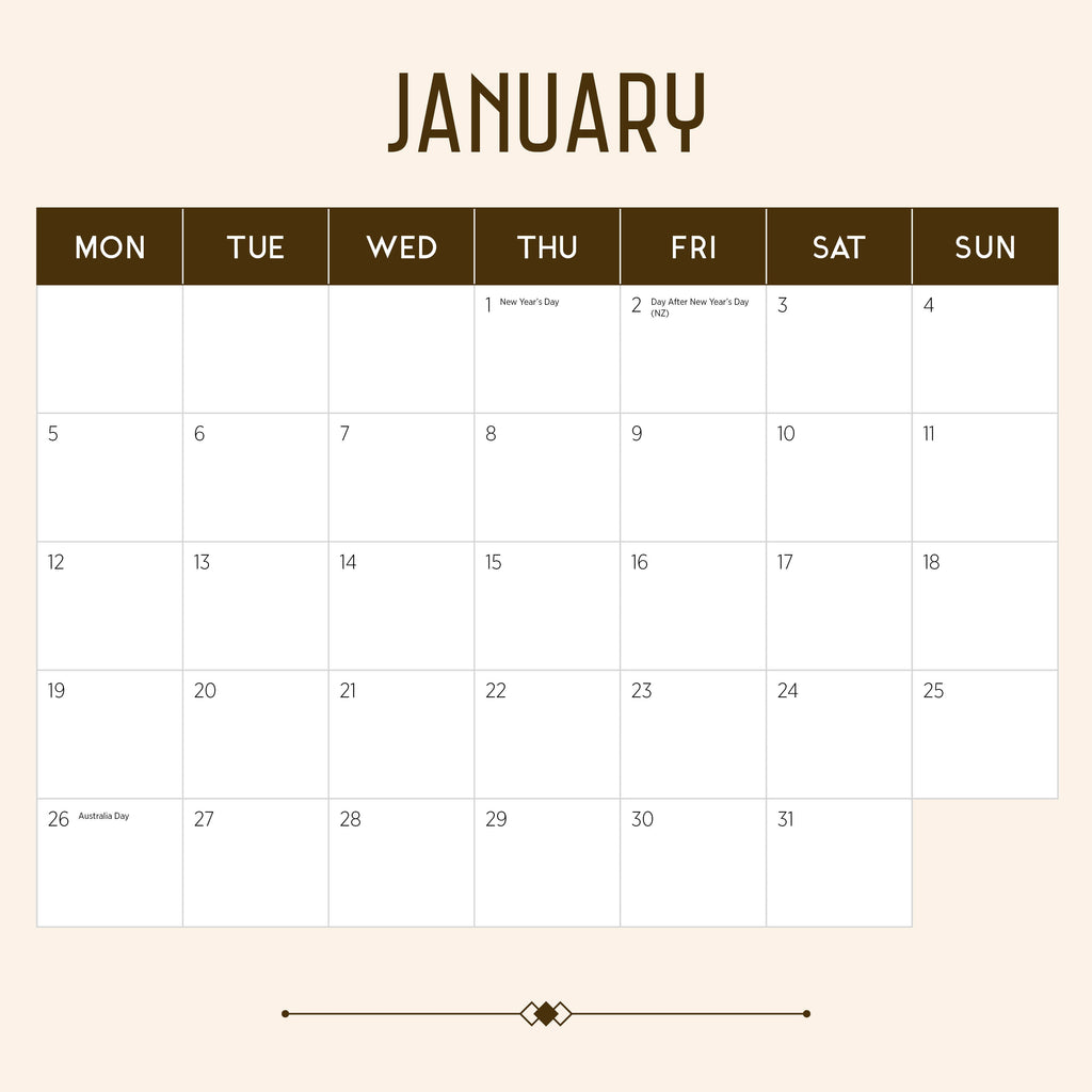 This square wall calendar covers 18-Months. Every month of the year from January 2026 to December 2026 is included, with 2027 dates also listed on a separate single-page overview. The size of the wall calendar is 300mm x 600mm when opened. Each week displayed in the calendar begins on a Monday, and all major Public Holidays and 2026 School Term dates for Australian and New Zealand Public Schools are also included. You won’t miss a beat in 2026!
