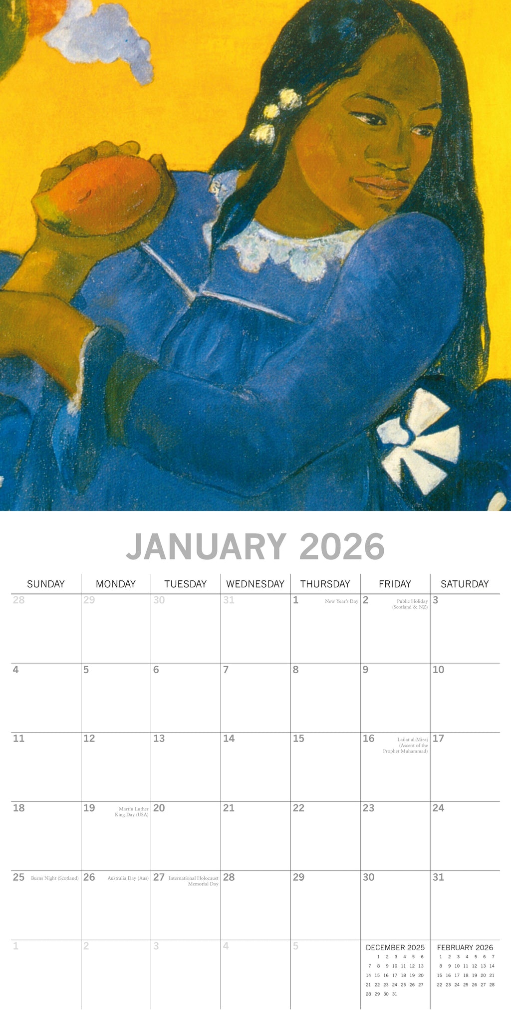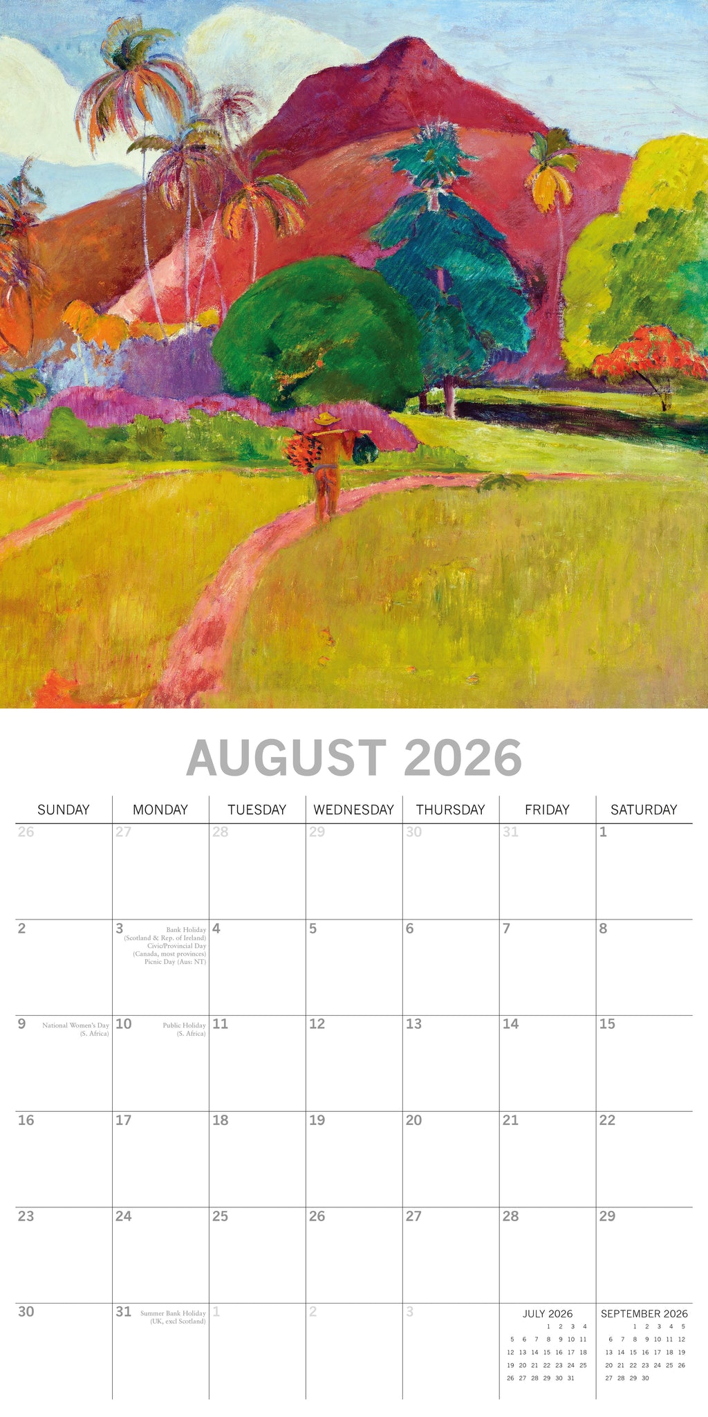 The 2026 Gauguin Square Wall Calendar spans 16 months—from September 2025 through December 2026—with the final four months of 2025 presented in a compact, mini-grid format. Each monthly spread begins on Sunday, with the top half showcasing a beautiful image and the bottom half featuring an easy-to-read monthly layout. The calendar comes shrink-wrapped for protection. .