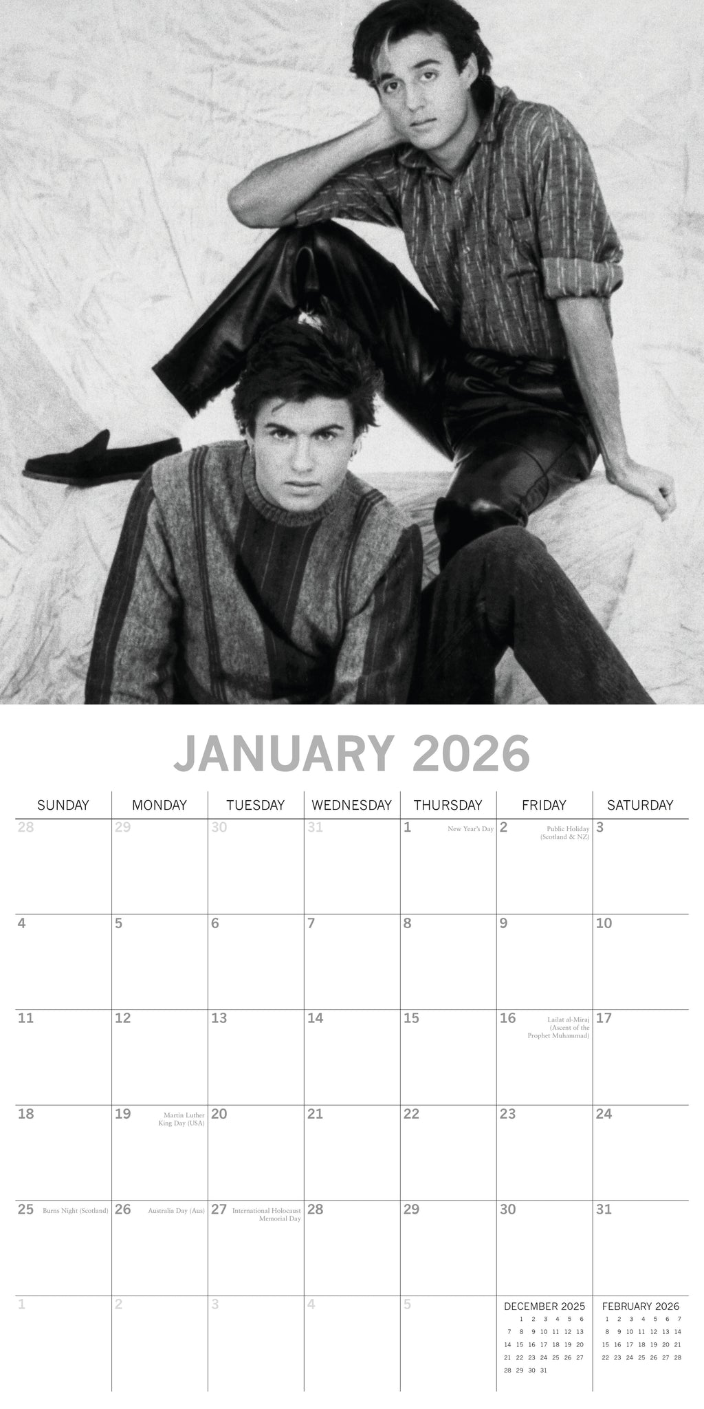 The 2026 George Michael Square Wall Calendar spans 16 months—from September 2025 through December 2026—with the final four months of 2025 presented in a compact, mini-grid format. Each monthly spread begins on Sunday, with the top half showcasing a beautiful image and the bottom half featuring an easy-to-read monthly layout. The calendar comes shrink-wrapped for protection. .