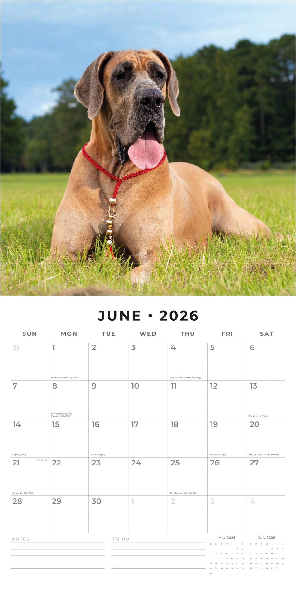 Packaged in a 100% plastic-free, sustainable, FSC-certified envelope, this 2026 Great Danes Square Wall Calendar from Red Robin Publishing Ltd includes 12 months plus 4 bonus months, providing extended planning and a full year of enjoyment. .