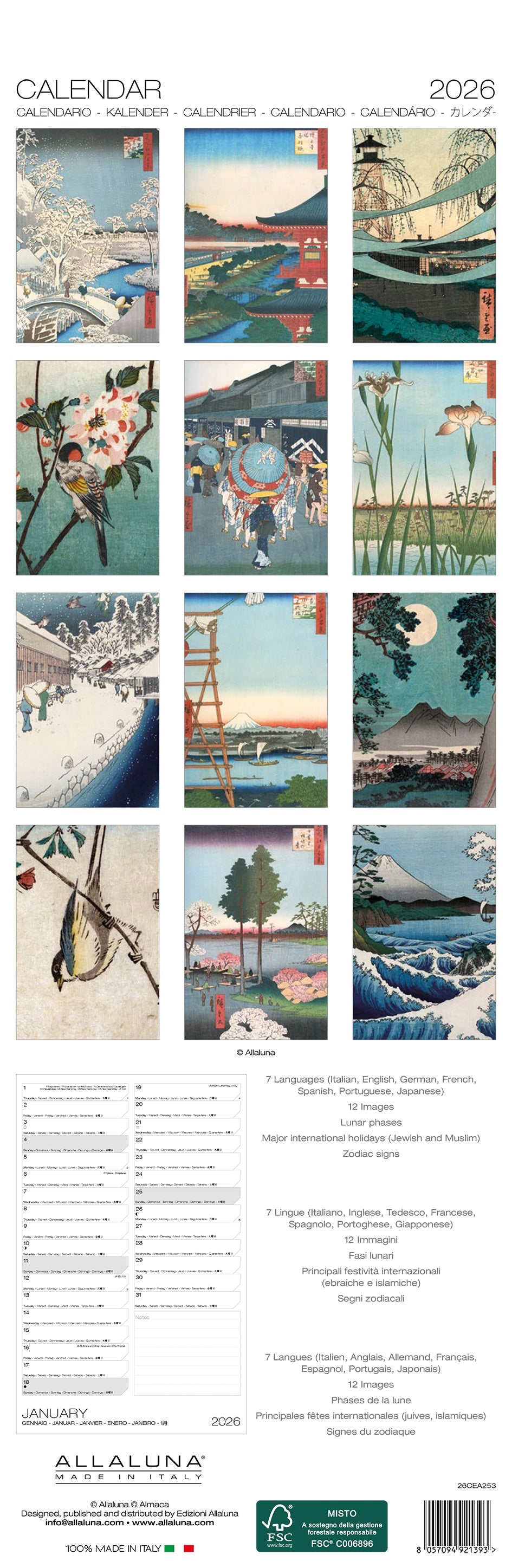 - Large grid with lunar phases, international holidays including Jewish and Muslim, zodiac signs