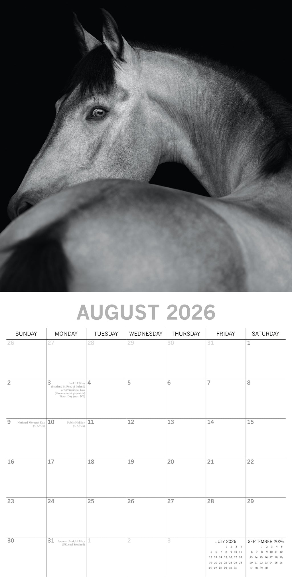 The 2026 Horse Portraits Square Wall Calendar spans 16 months—from September 2025 through December 2026—with the final four months of 2025 presented in a compact, mini-grid format. Each monthly spread begins on Sunday, with the top half showcasing a beautiful image and the bottom half featuring an easy-to-read monthly layout. The calendar comes shrink-wrapped for protection. .