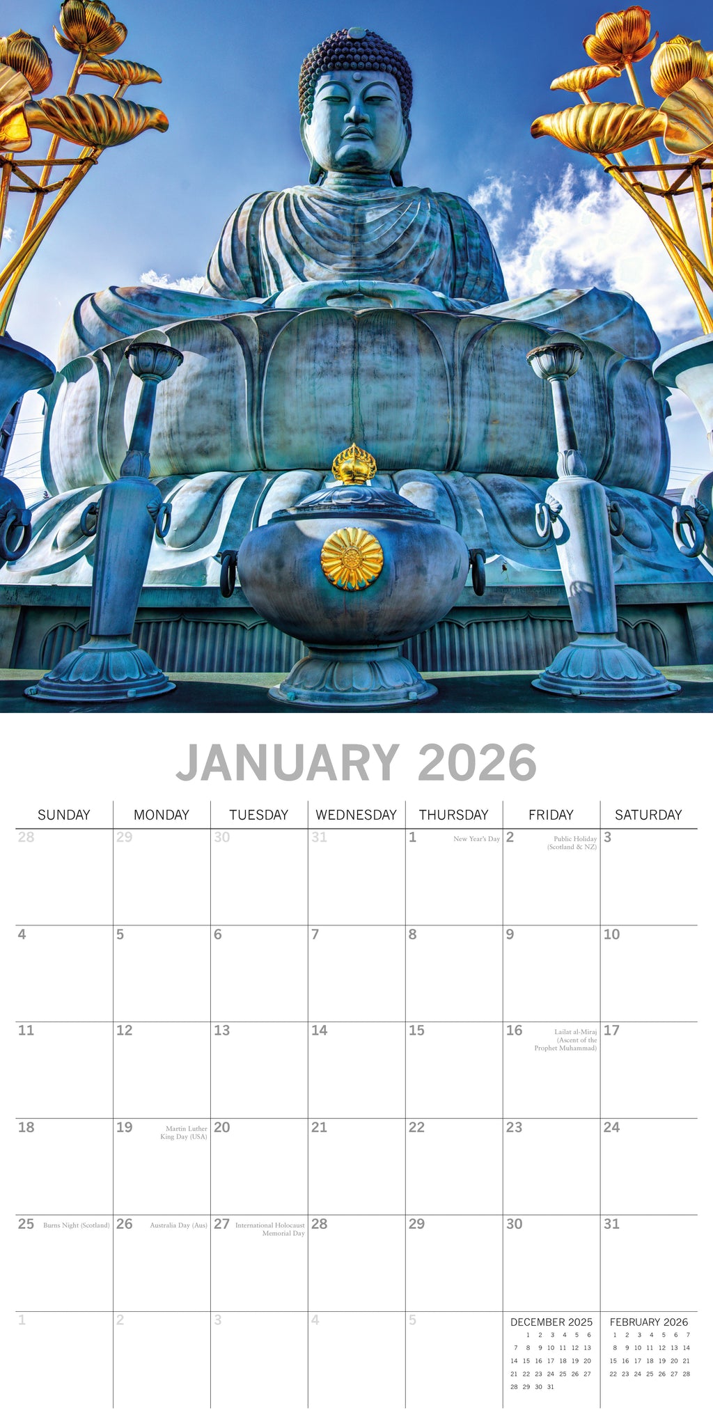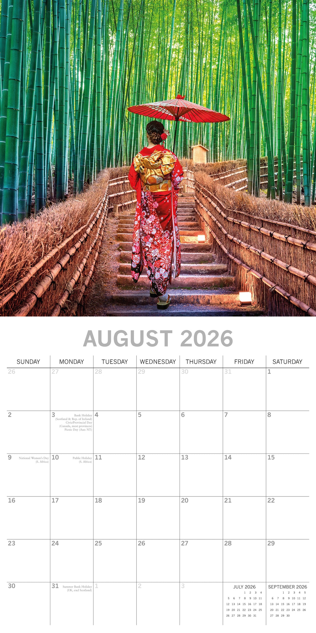 The 2026 Japan Square Wall Calendar spans 16 months—from September 2025 through December 2026—with the final four months of 2025 presented in a compact, mini-grid format. Each monthly spread begins on Sunday, with the top half showcasing a beautiful image and the bottom half featuring an easy-to-read monthly layout. The calendar comes shrink-wrapped for protection. .