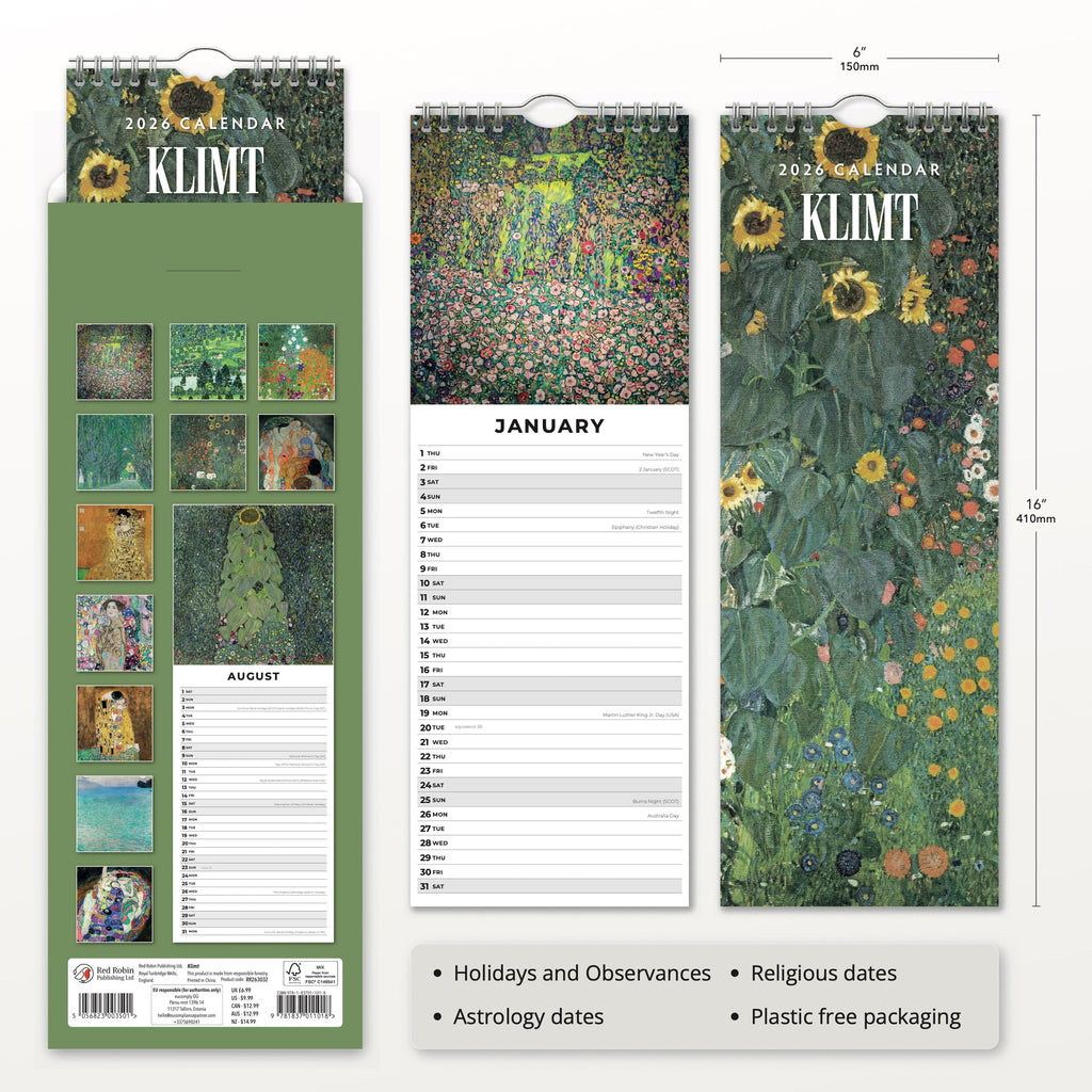 Thoughtfully packaged in a 100% plastic-free, sustainable, FSC-certified envelope, this 2026 Klimt Slim Wall Calendar from Red Robin Publishing Ltd includes all 12 months plus 4 bonus months, offering extended planning and year-round enjoyment. .