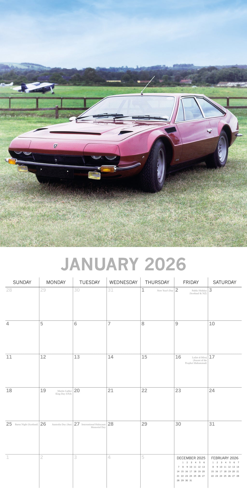 The 2026 Lamborghini Square Wall Calendar spans 16 months—from September 2025 through December 2026—with the final four months of 2025 presented in a compact, mini-grid format. Each monthly spread begins on Sunday, with the top half showcasing a beautiful image and the bottom half featuring an easy-to-read monthly layout. The calendar comes shrink-wrapped for protection. .