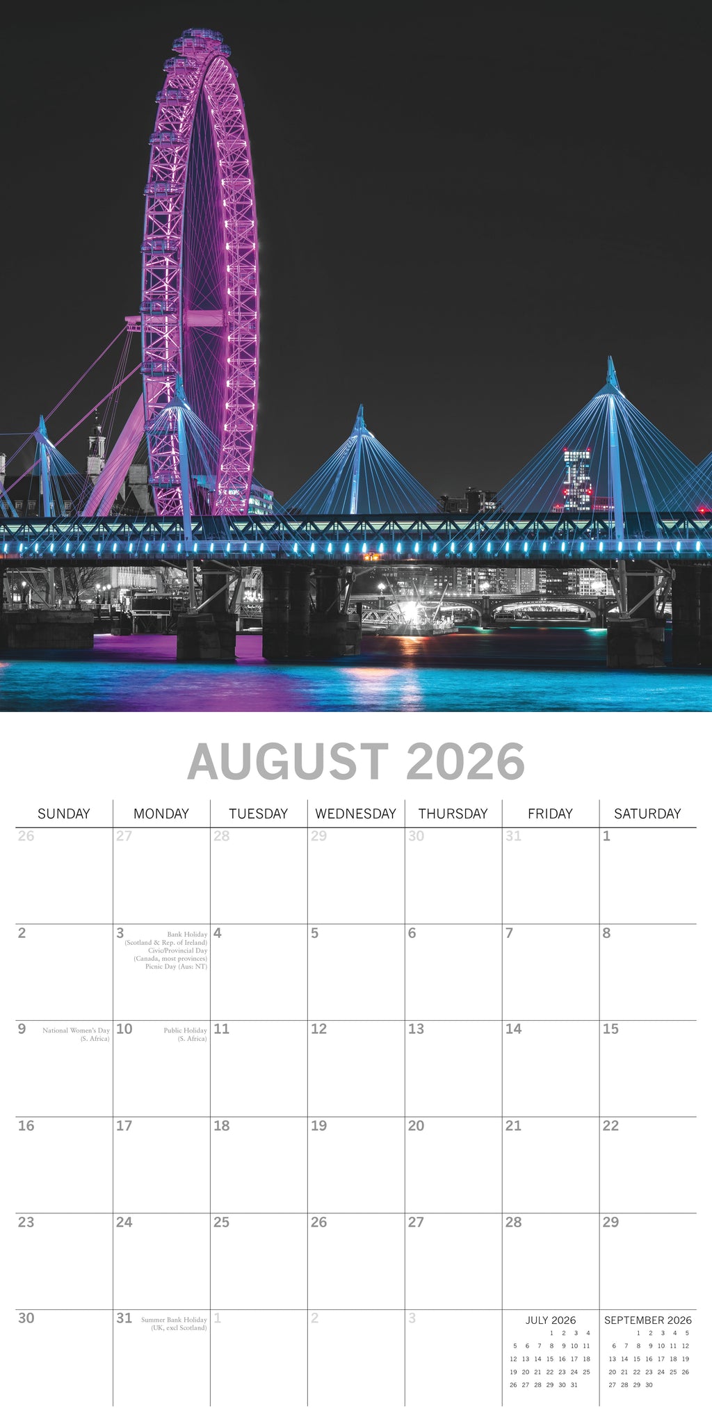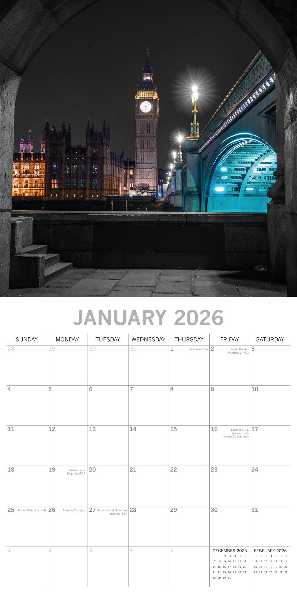 The 2026 London Limelight Square Wall Calendar spans 16 months—from September 2025 through December 2026—with the final four months of 2025 presented in a compact, mini-grid format. Each monthly spread begins on Sunday, with the top half showcasing a beautiful image and the bottom half featuring an easy-to-read monthly layout. The calendar comes shrink-wrapped for protection. .