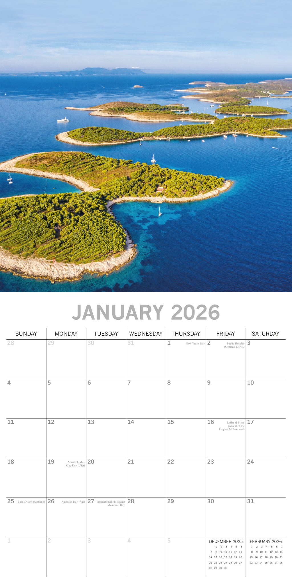 The 2026 Mediterranean Square Wall Calendar spans 16 months—from September 2025 through December 2026—with the final four months of 2025 presented in a compact, mini-grid format. Each monthly spread begins on Sunday, with the top half showcasing a beautiful image and the bottom half featuring an easy-to-read monthly layout. The calendar comes shrink-wrapped for protection. .
