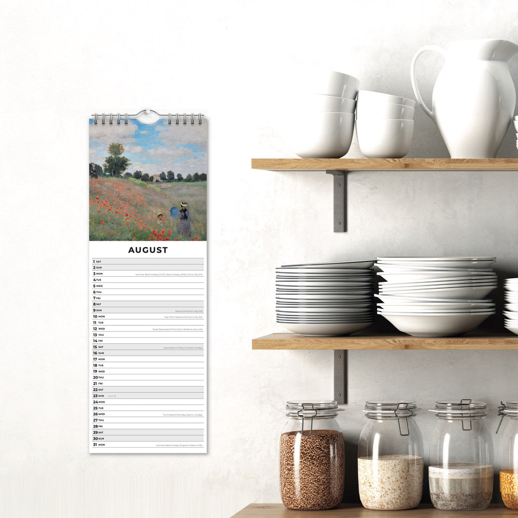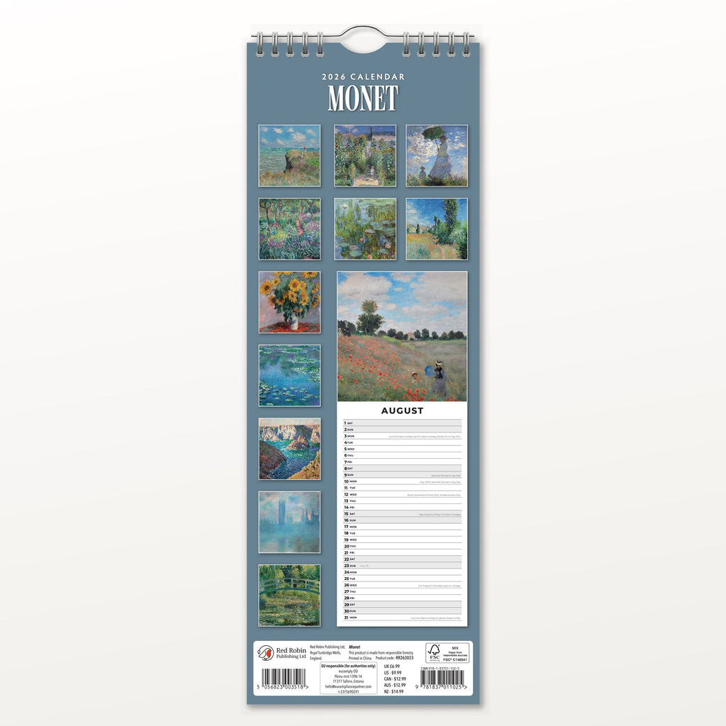 Explore the year ahead with our exquisite 2026 Monet - Slim Wall Calendar, showcasing 12 stunning 41 x 15 cm images—one for each month. With its sleek vertical format, this calendar brings a stylish and space-saving touch to any wall, while highlighting the beauty of Monet throughout the year.