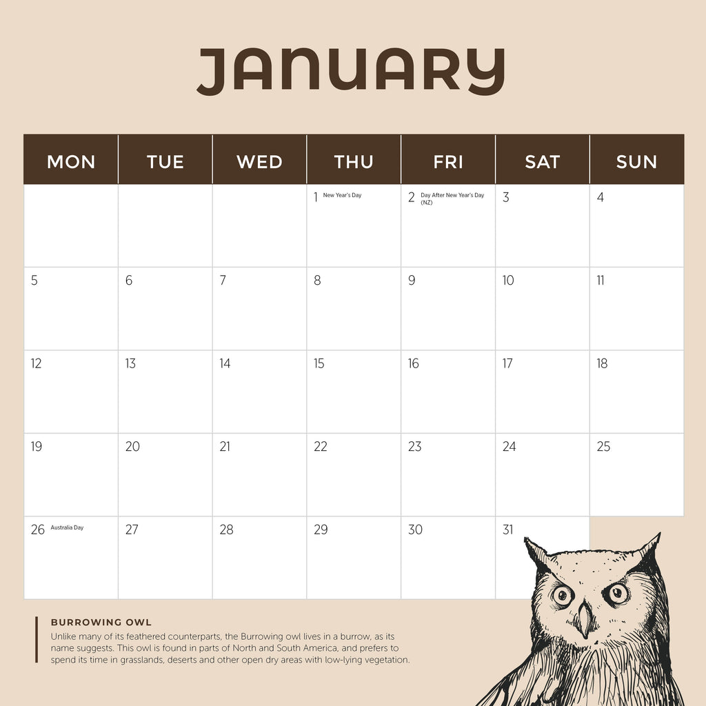 What makes owls so mysterious to us? They have had a powerful hold on the human imagination for centuries, appearing as warnings of doom and as symbols of wisdom. A wise owl once said, "Mark it on a calendar, for you will not remember otherwise." Let this wisdom guide 2026 wall calendar you through the year ahead and be your most organised self.