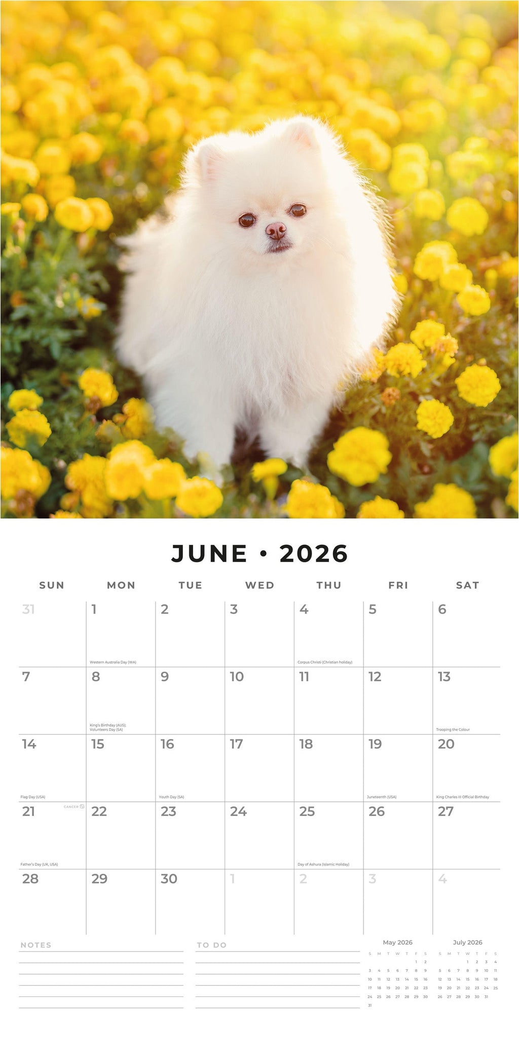 Packaged in a 100% plastic-free, sustainable, FSC-certified envelope, this 2026 Pomeranians Square Wall Calendar from Red Robin Publishing Ltd includes 12 months plus 4 bonus months, providing extended planning and a full year of enjoyment. .