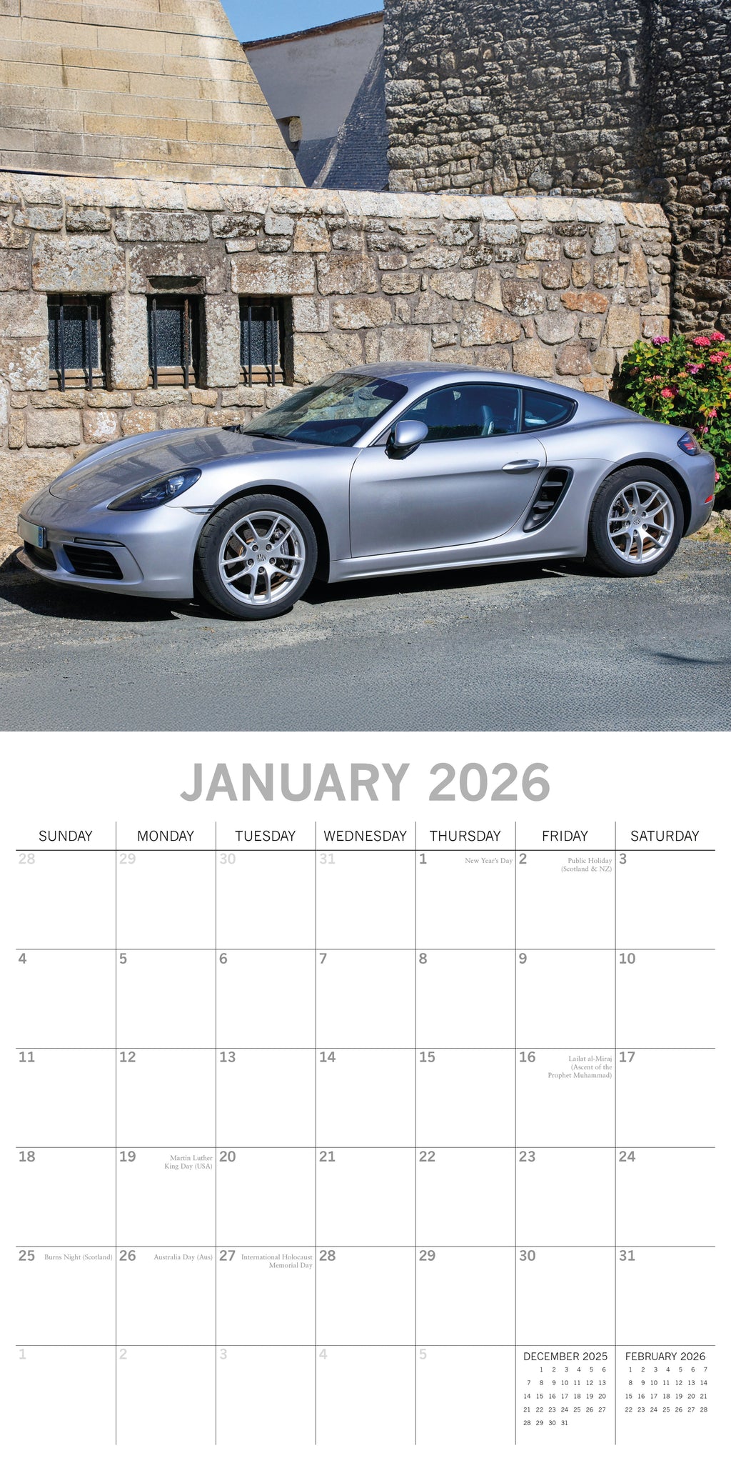 The 2026 Porsche Square Wall Calendar spans 16 months—from September 2025 through December 2026—with the final four months of 2025 presented in a compact, mini-grid format. Each monthly spread begins on Sunday, with the top half showcasing a beautiful image and the bottom half featuring an easy-to-read monthly layout. The calendar comes shrink-wrapped for protection. .