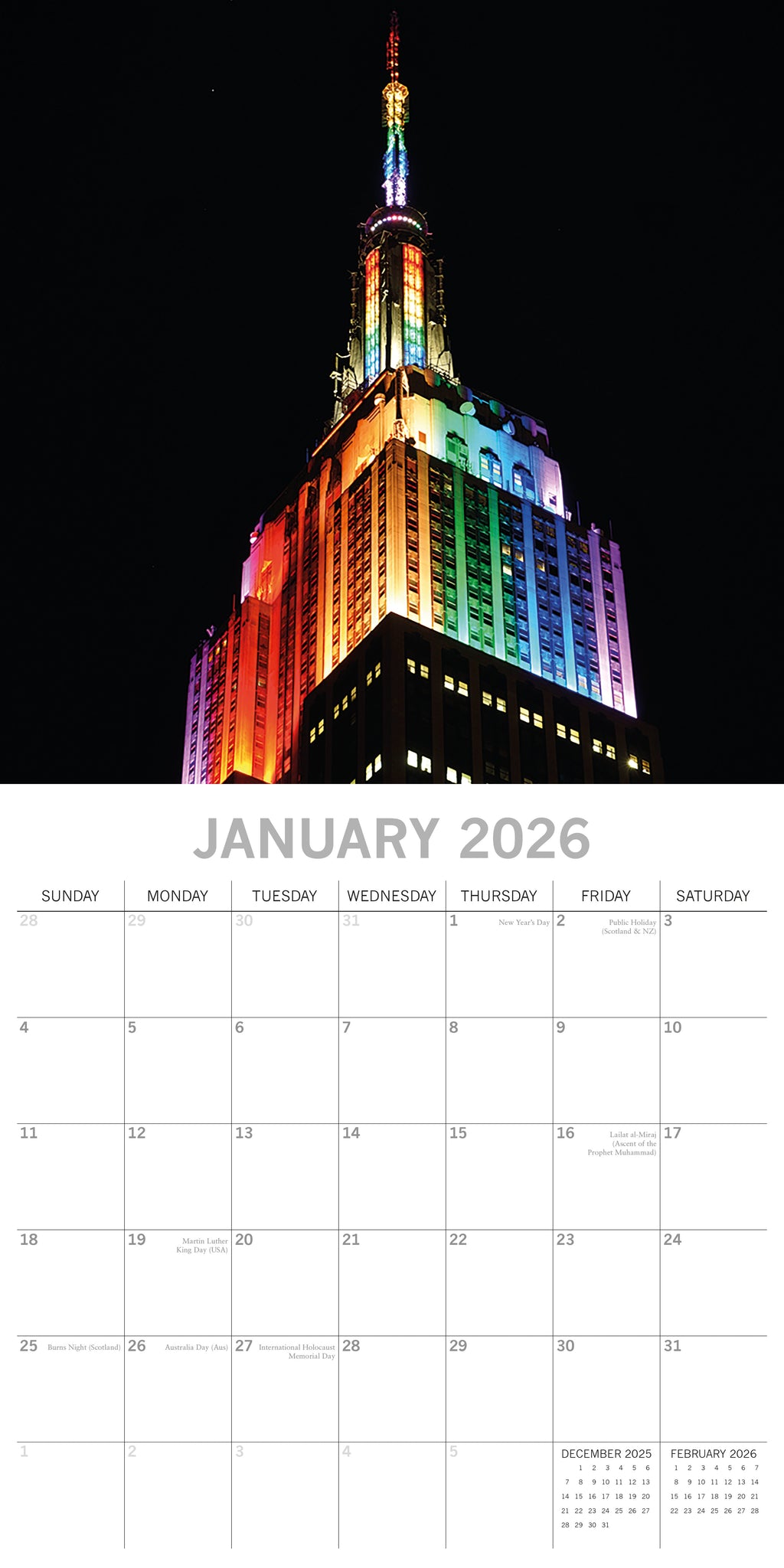 The 2026 Rainbows Square Wall Calendar spans 16 months—from September 2025 through December 2026—with the final four months of 2025 presented in a compact, mini-grid format. Each monthly spread begins on Sunday, with the top half showcasing a beautiful image and the bottom half featuring an easy-to-read monthly layout. The calendar comes shrink-wrapped for protection. .