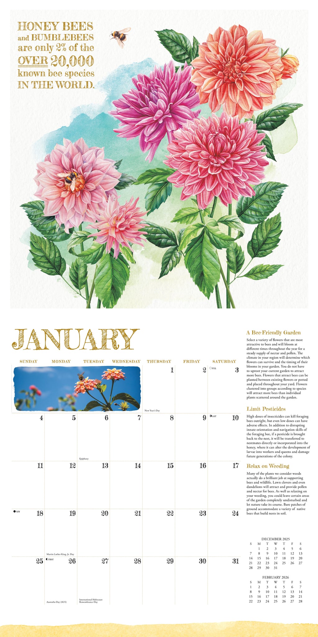 To bee or not to bee, that is the question. From honeys to bumbles, it's increasingly apparent that bees play an important role in how humans function in our day to day lives. Each month of this calendar features beautiful illustrations along with informative information about bees, honey, beeswax, the structure and hierarchy of their hives, tips on how to create the perfect habitat around your home, and even an overview of how to become a beekeeper yourself!