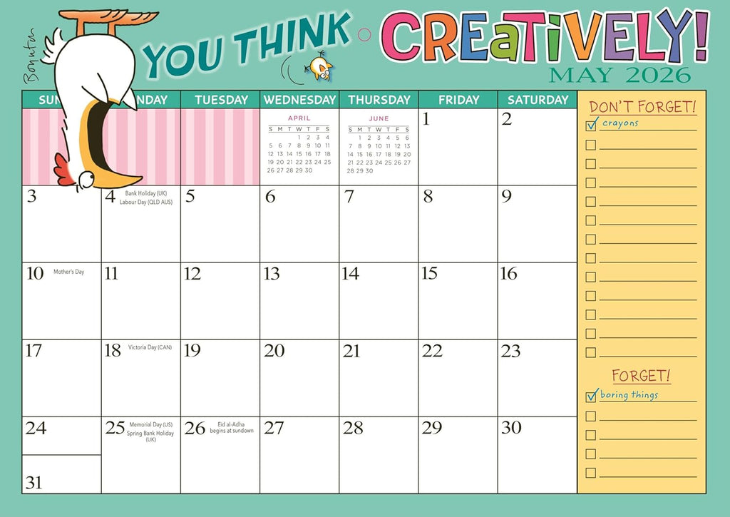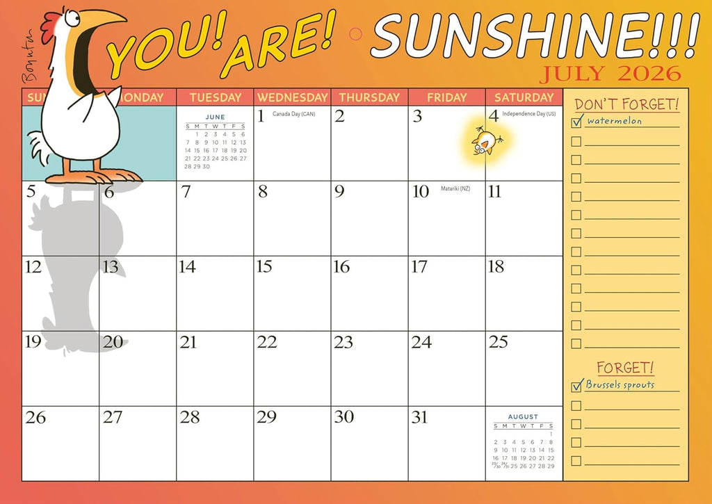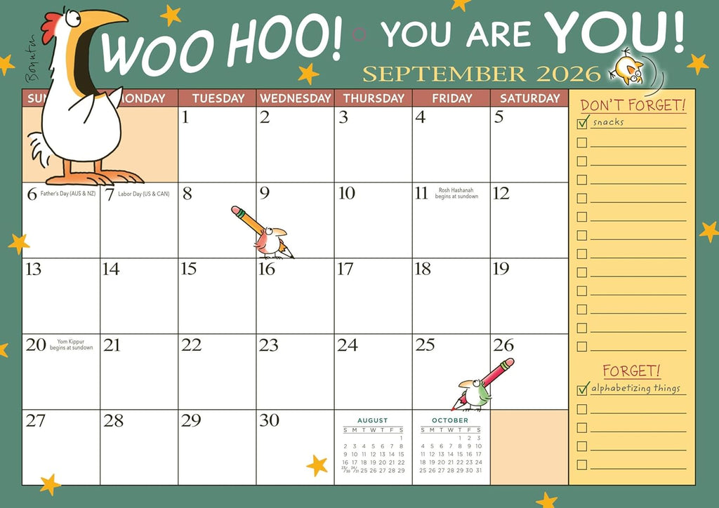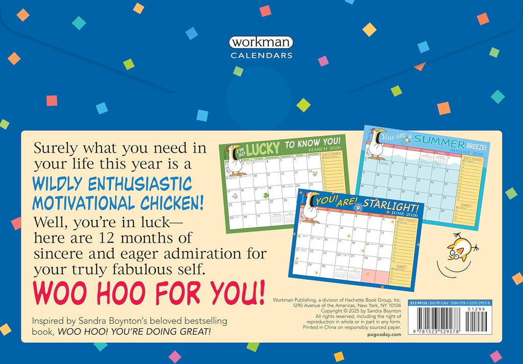 WOO HOO!: Beloved cartoonist, author, and songwriter Sandra Boynton offers motivation and encouragement with her screaming chicken. Each month brings one of her iconic chickens cheering you on and reminding you of your awesomeness with messages like You are simply FANTASTIC! and Your laughter SPARKLES!