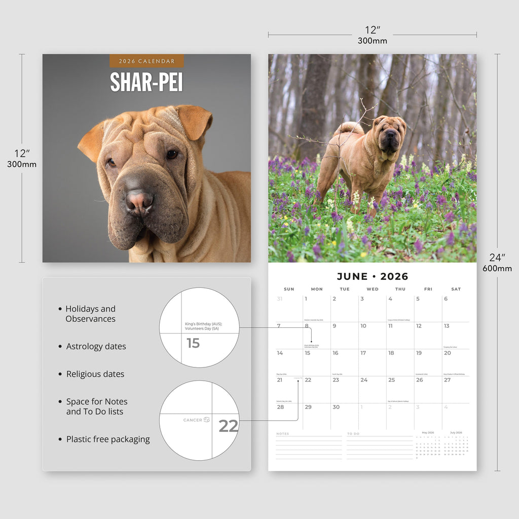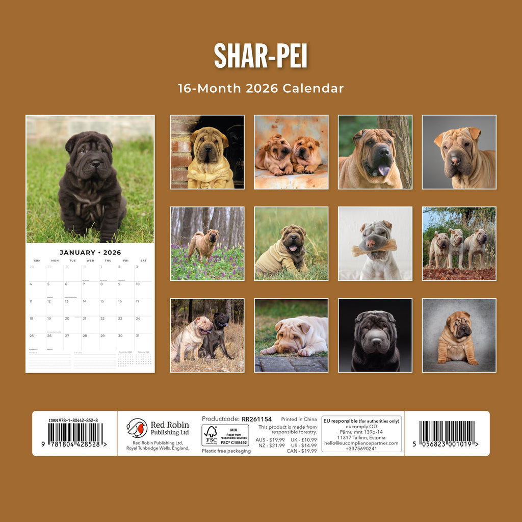 Packaged in a 100% plastic-free, sustainable, FSC-certified envelope, this 2026 Shar-Pei Square Wall Calendar from Red Robin Publishing Ltd includes 12 months plus 4 bonus months, providing extended planning and a full year of enjoyment. .