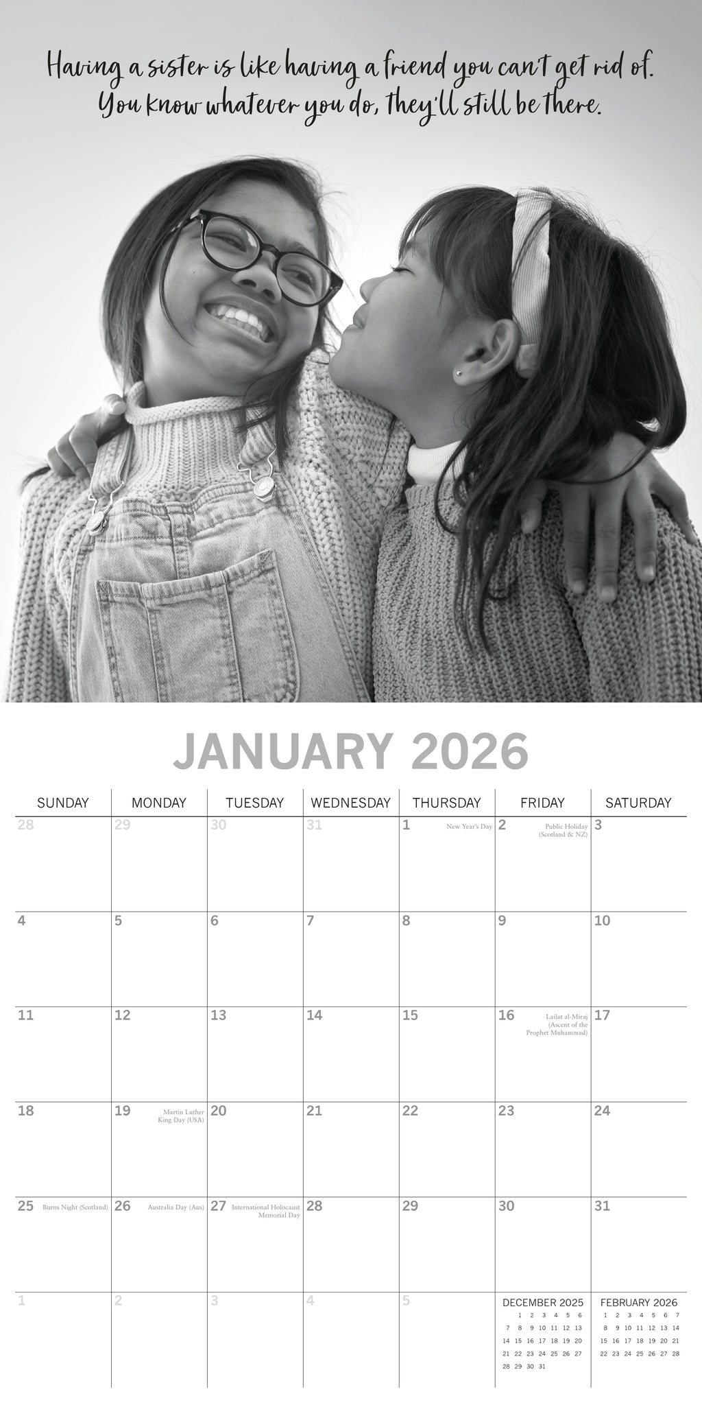 This exquisitely designed 2026 Sisters Square Wall Calendar from The Gifted Stationery Co. is ideal for your home or office and makes a thoughtful holiday gift for your loved ones. It features 13 stunning images of Sisters and includes large date grids for jotting down appointments, birthdays, and other important events. When opened, it measures 30 x 60 cm.